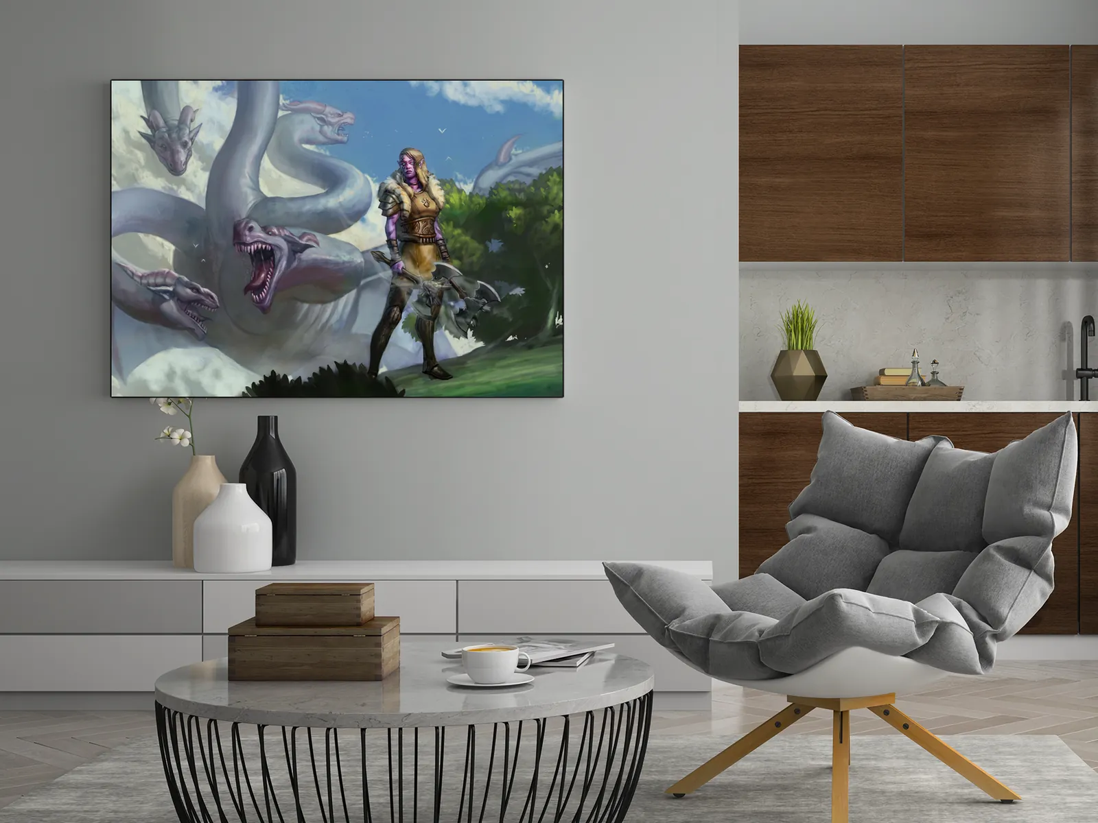 Finally, on the wall this fine art canvas commands attention through scale, contrast, and narrative clarity. Above all, the Maetra And Gauzmai serpent stand canvas artwork anchors a space with mythic presence, rewarding longer viewing as armor textures, expressions, and creature anatomy reveal depth and intent.