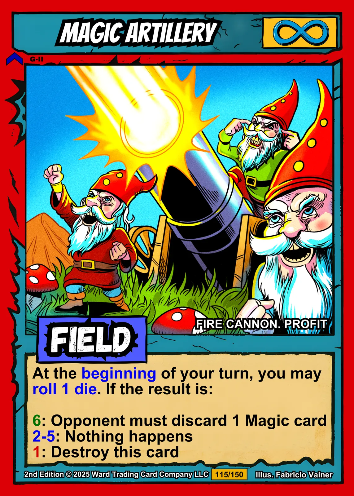 Additionally, the red torn-edge border frames the title ‘MAGIC ARTILLERY’ in metallic silver text. A blue infinity symbol sits in the top corner. The purple ‘FIELD’ banner runs beneath the illustration with ‘FIRE CANNON. PROFIT’ text.