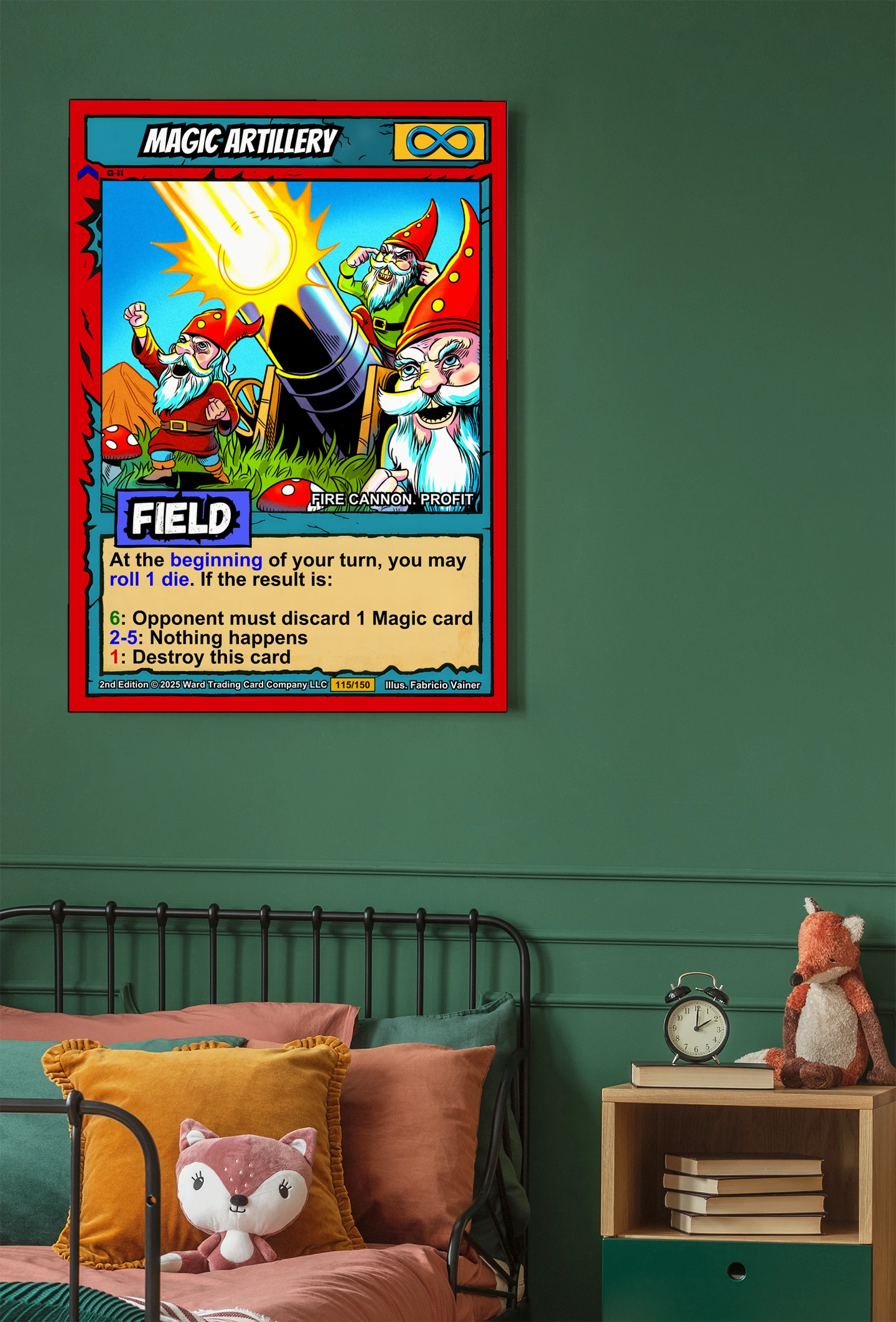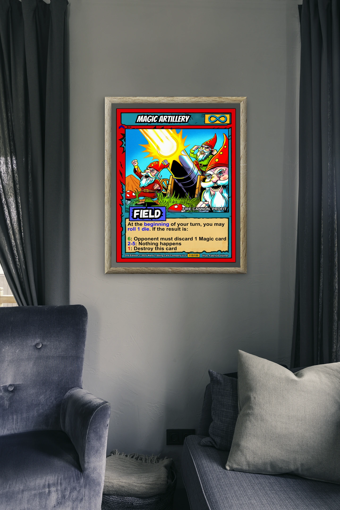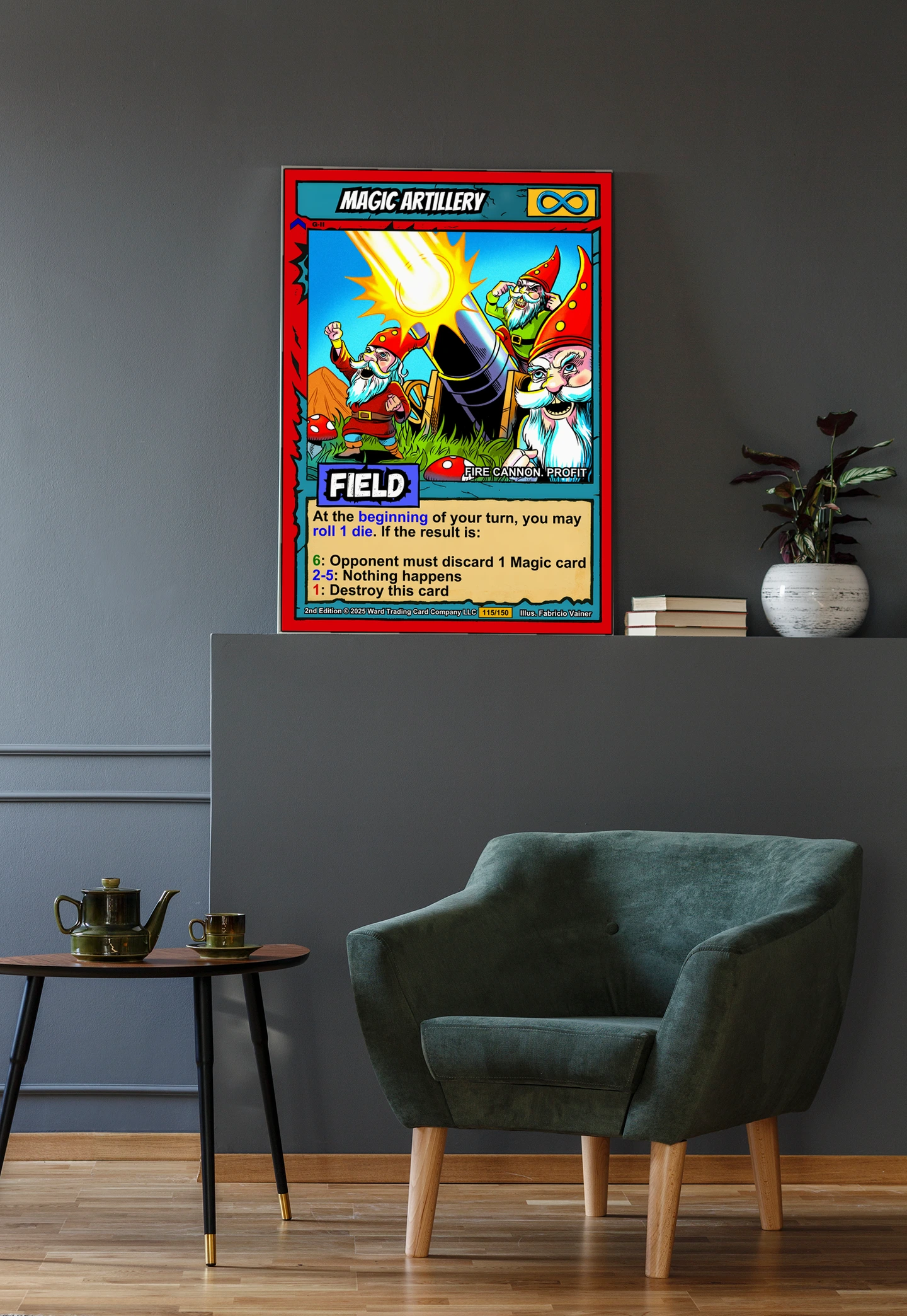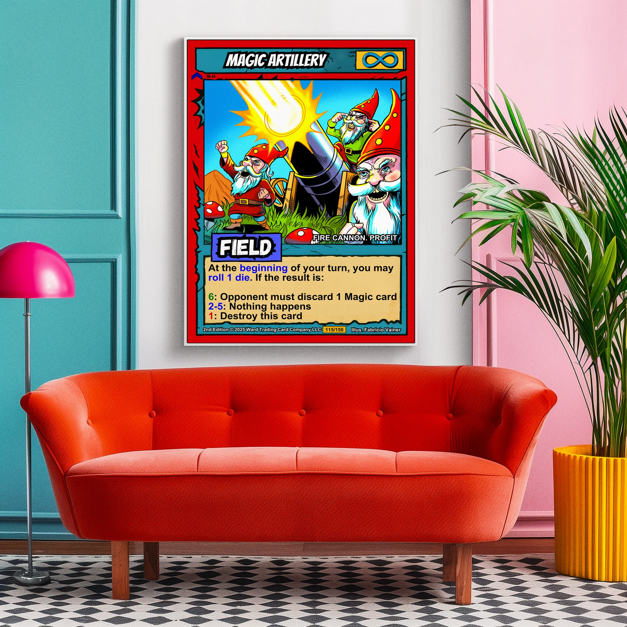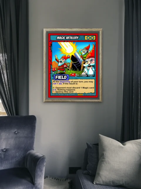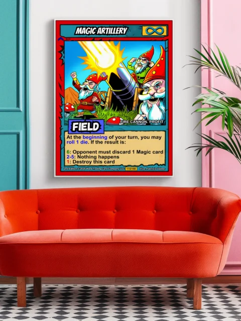 At room scale, the saturated colors and bold linework read clearly across any space. This magic artillery trading card canvas print speaks to Ward TCG collectors who appreciate comedic fantasy art. The whimsical gnome crew and exaggerated expressions deliver instant personality.