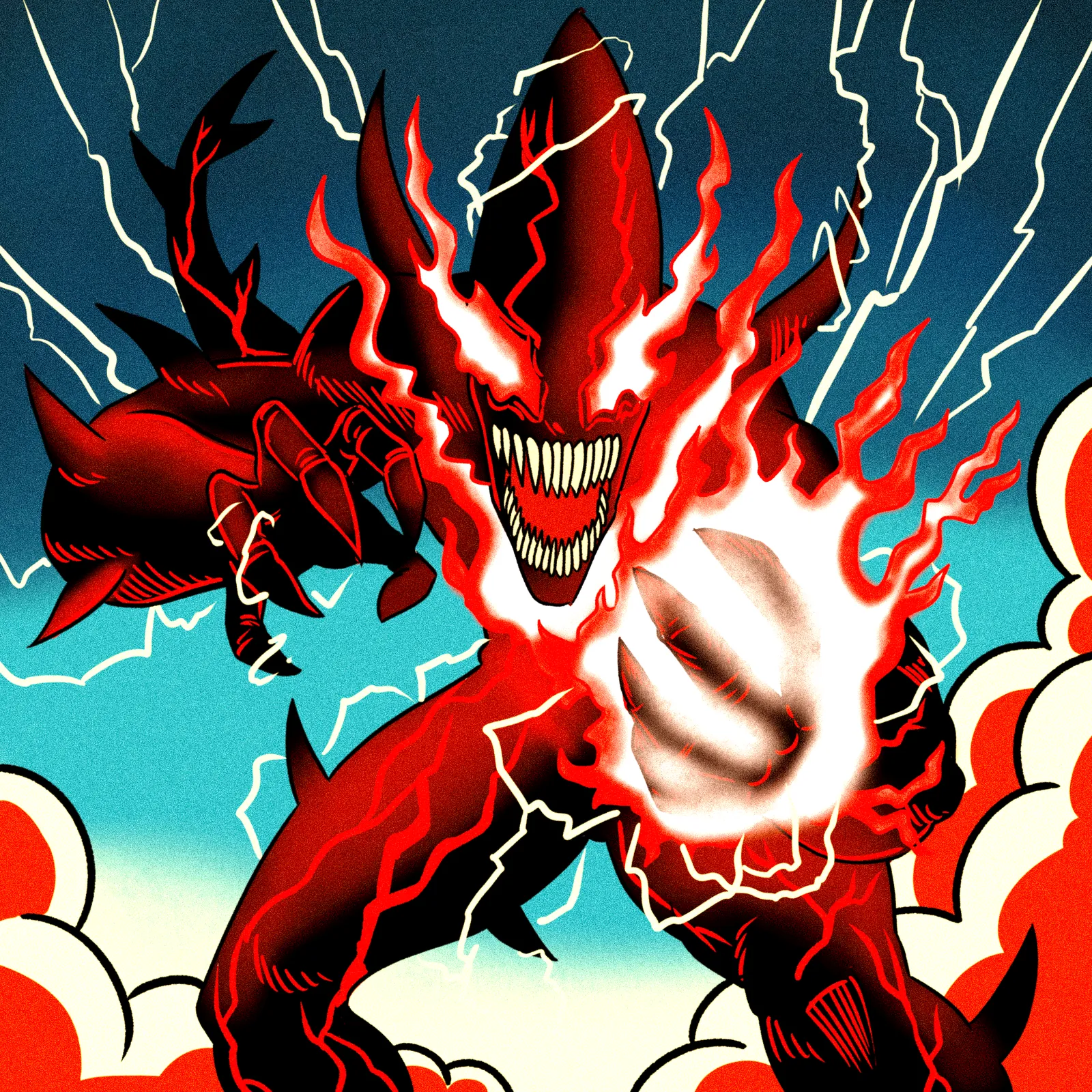 Additionally, the color palette contrasts dark red armor against teal sky and white lightning. Heavy black outlines define every jagged edge and angular form with graphic novel precision. Moreover, halftone textures add depth to the flat color fills throughout.