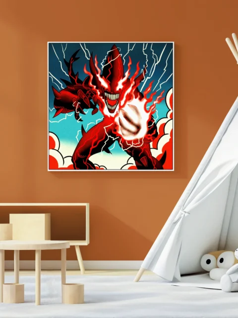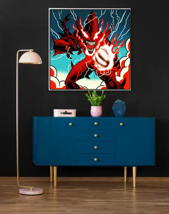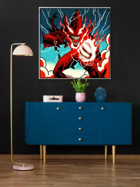 On the wall, the creature’s menacing grin commands attention at full scale. Ward TCG collectors and comic book art enthusiasts both appreciate Vainer’s high-contrast style. This magic eater art trading card art canvas print brings demon energy home.