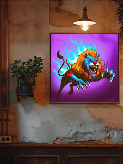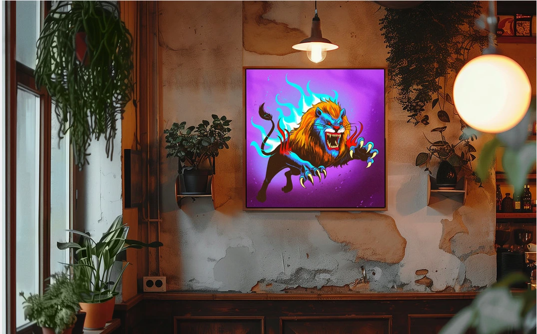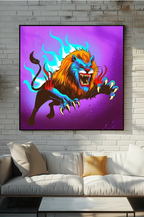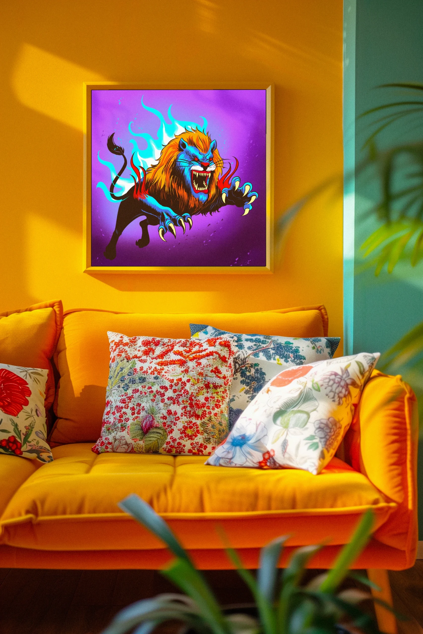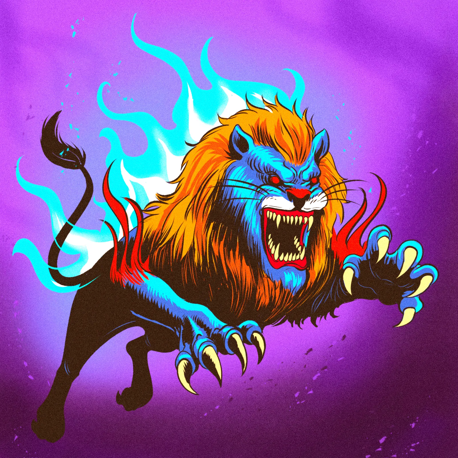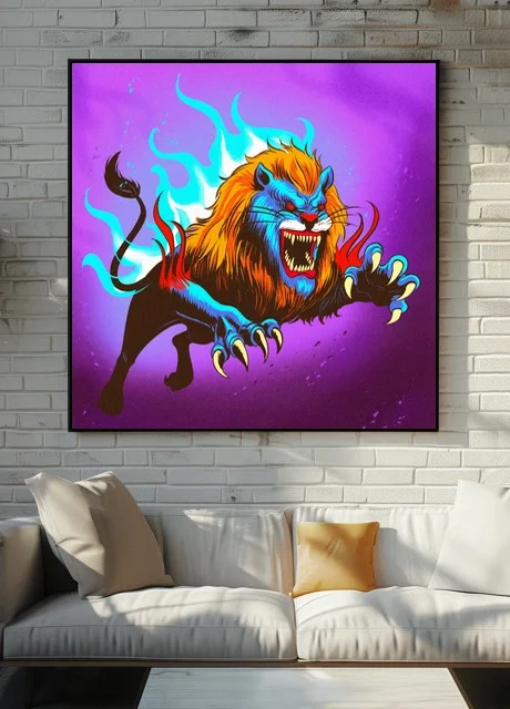Additionally, the color palette contrasts a dark blue-black body against an explosive orange-gold mane and cyan flames. The magenta-to-purple gradient background amplifies the neon saturation across the creature’s form. Moreover, red accents around the eyes and muzzle heighten the predatory ferocity.