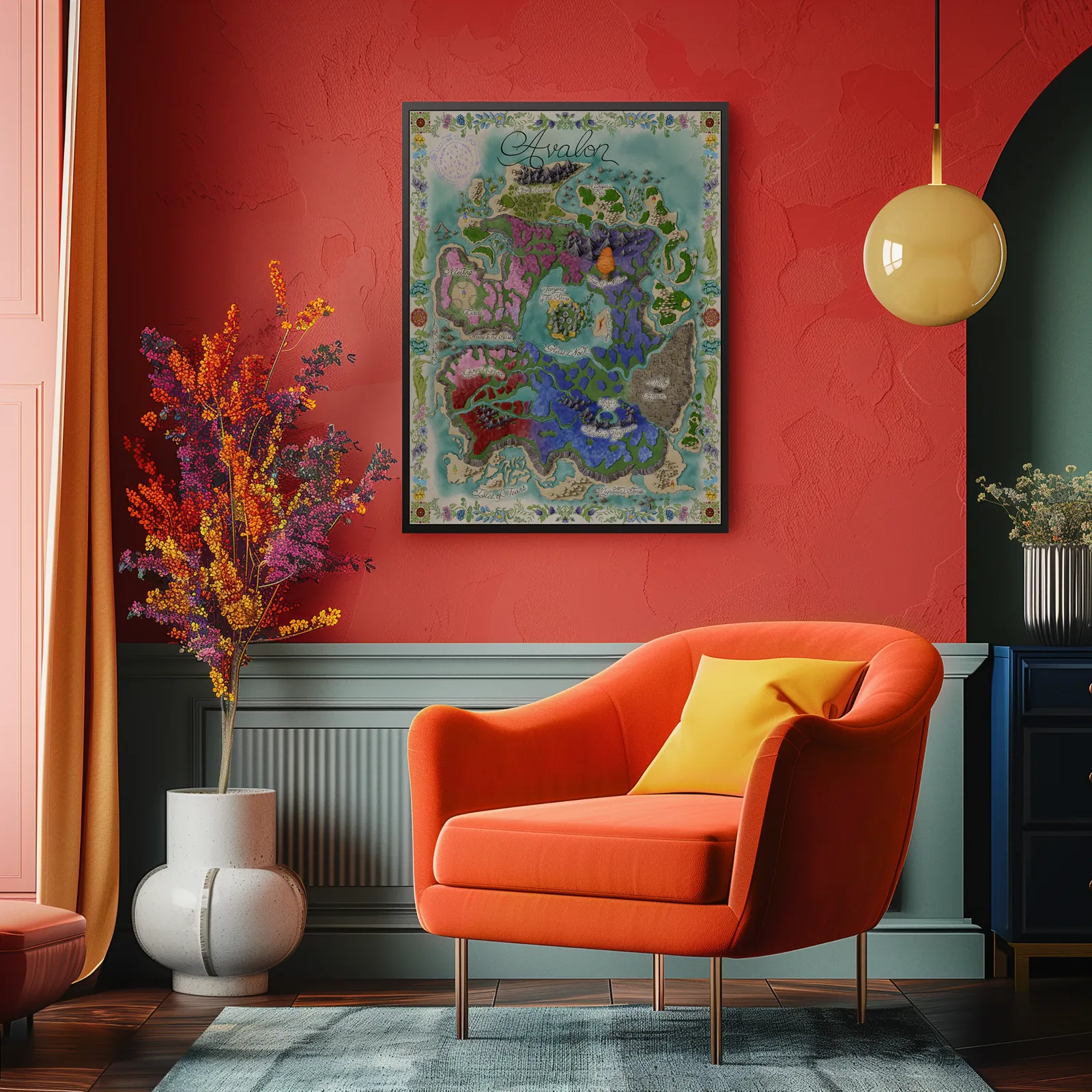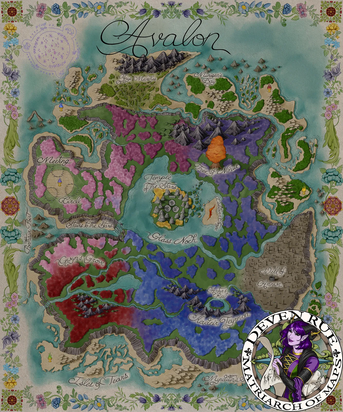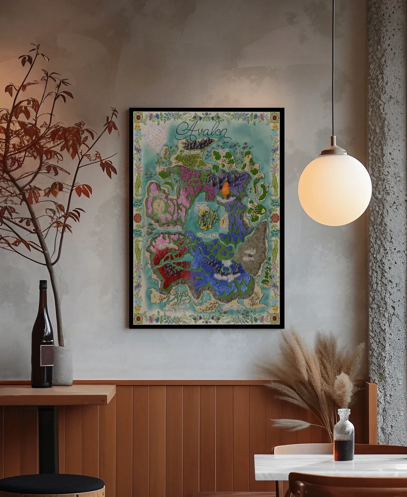 Map of Avalon employs a vibrant yet controlled palette of greens, blues, violets, and earthen reds. Consequently, each region retains a distinct identity while contributing to a cohesive whole. Decorative borders and hand-rendered details enhance the sense of a living myth. Thus, they create a visual impact that feels ceremonial, timeless, and immersive.