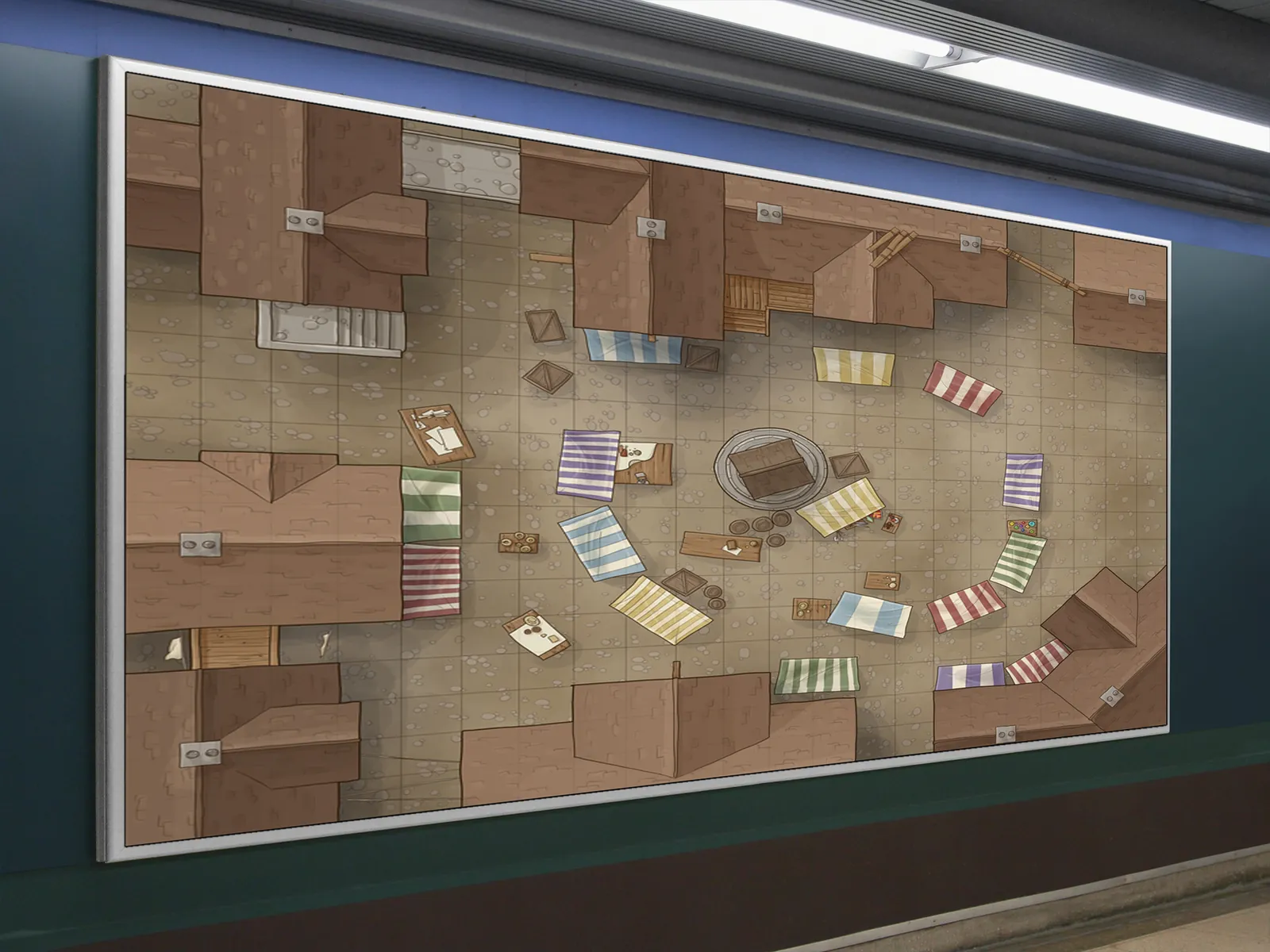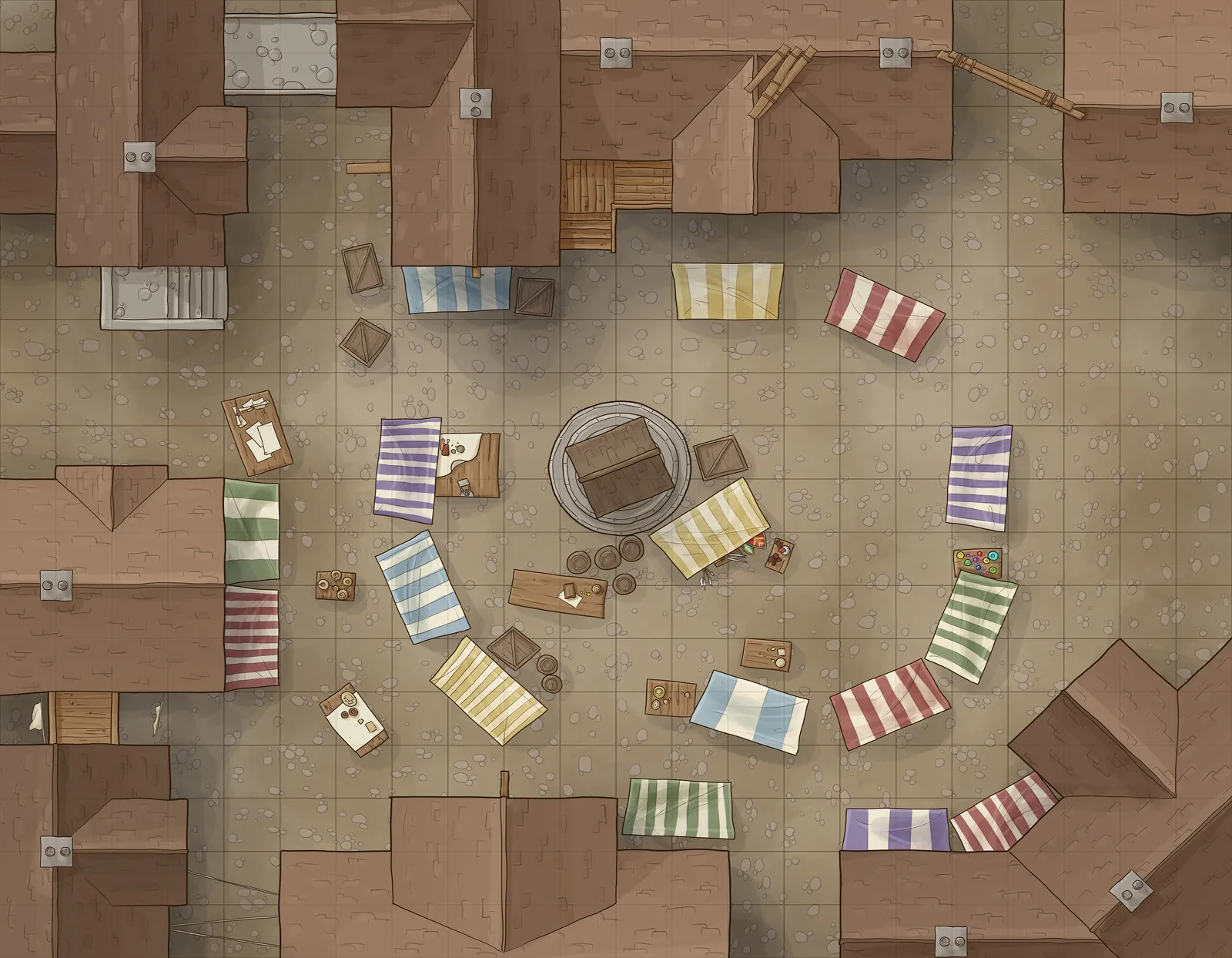 The Market Square Fantasy Map presents a bustling town center viewed from above, arranged around a central well and surrounded by merchant stalls, crates, and nearby buildings. Colorful awnings mark individual vendors, while open pathways create natural movement and encounter zones. As a result, the map immediately conveys the feel of a living marketplace in active use.