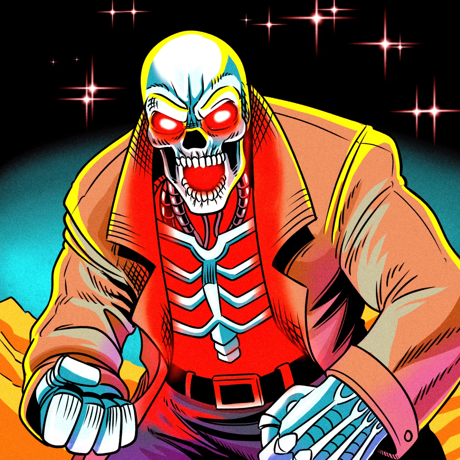 A skeletal figure with glowing red eyes clenches mechanical fists in confrontation. This metalic bone art trading card art canvas print captures Fabricio Vainer’s bold comic book illustration. The exposed ribcage and spine are rendered in cyan outlines, notably contrasting the white skull.