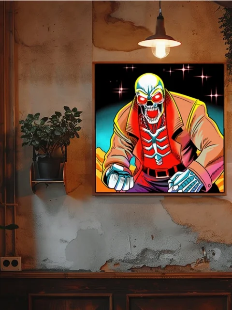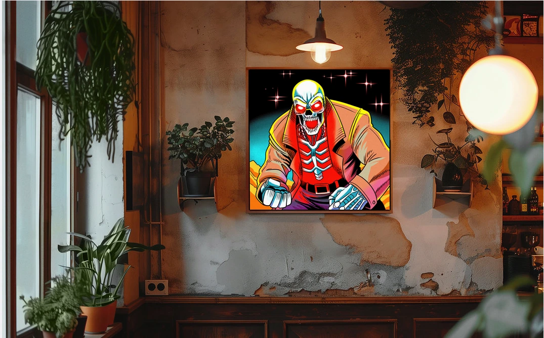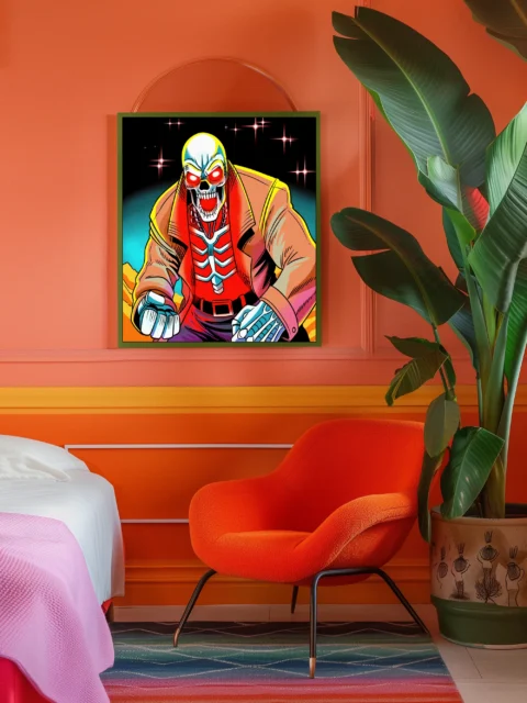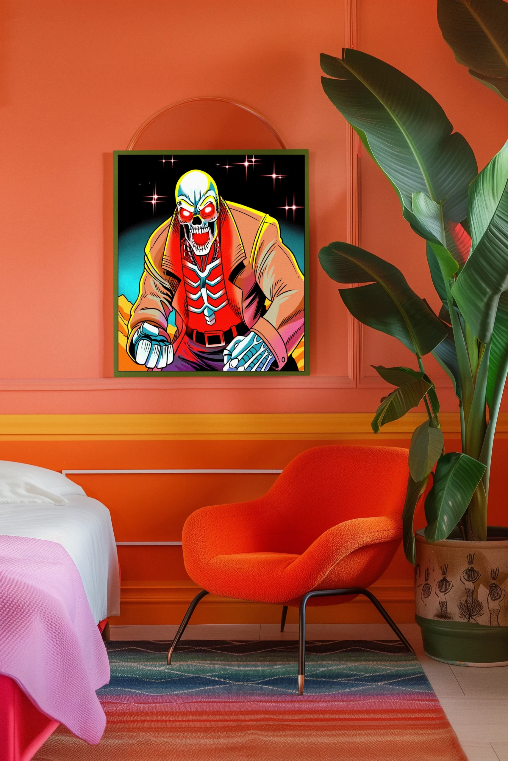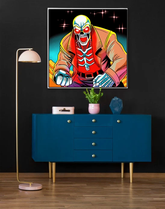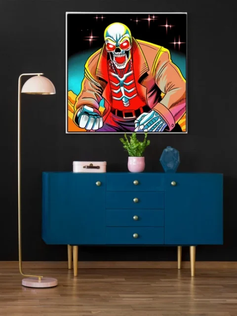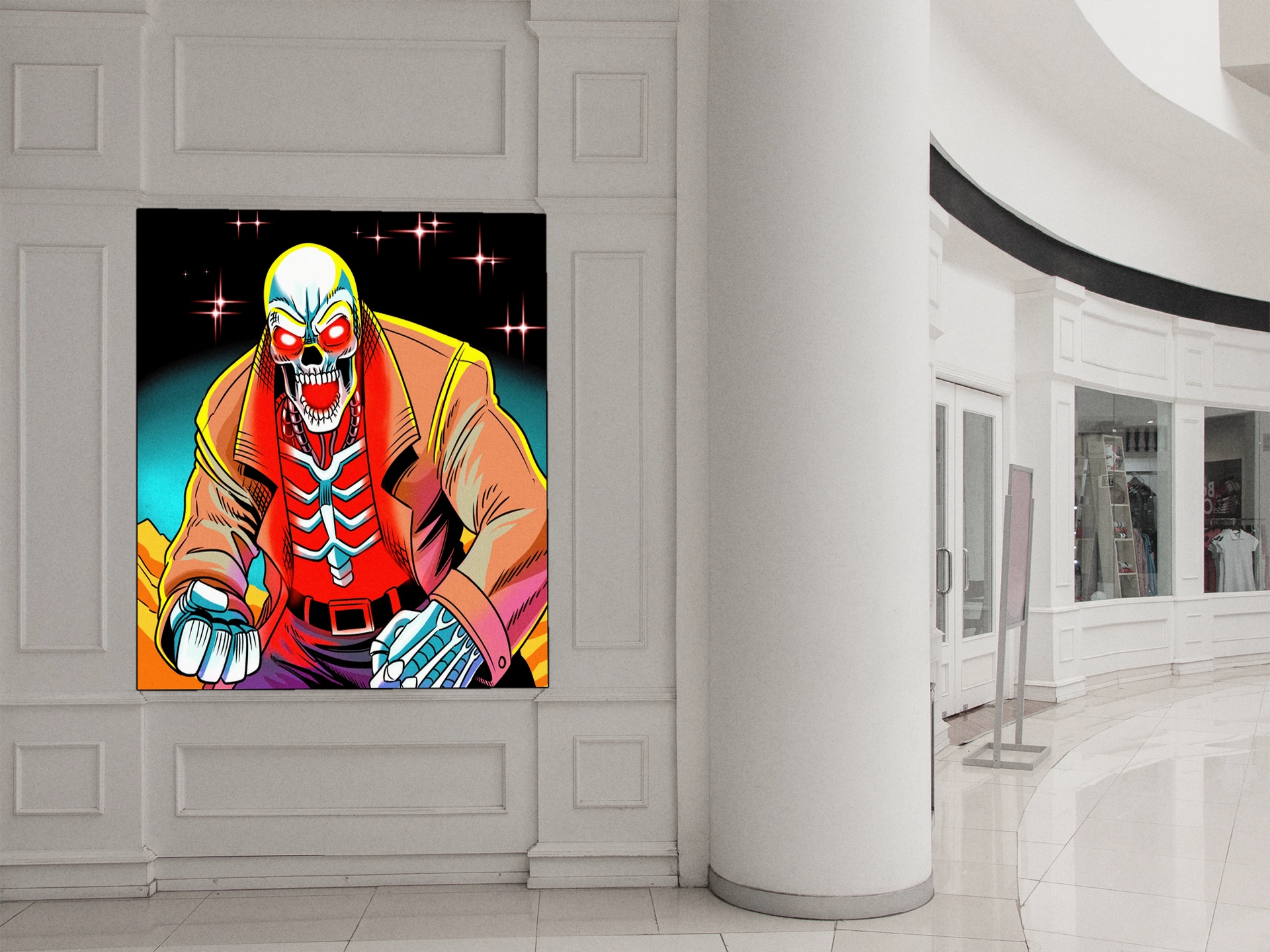 On the wall, the menacing skull reads as genuinely imposing at canvas scale. Ward TCG collectors and retro comic art fans gain a gallery-ready piece without borders. This metalic bone art trading card art canvas print delivers pure Vainer illustration uninterrupted.