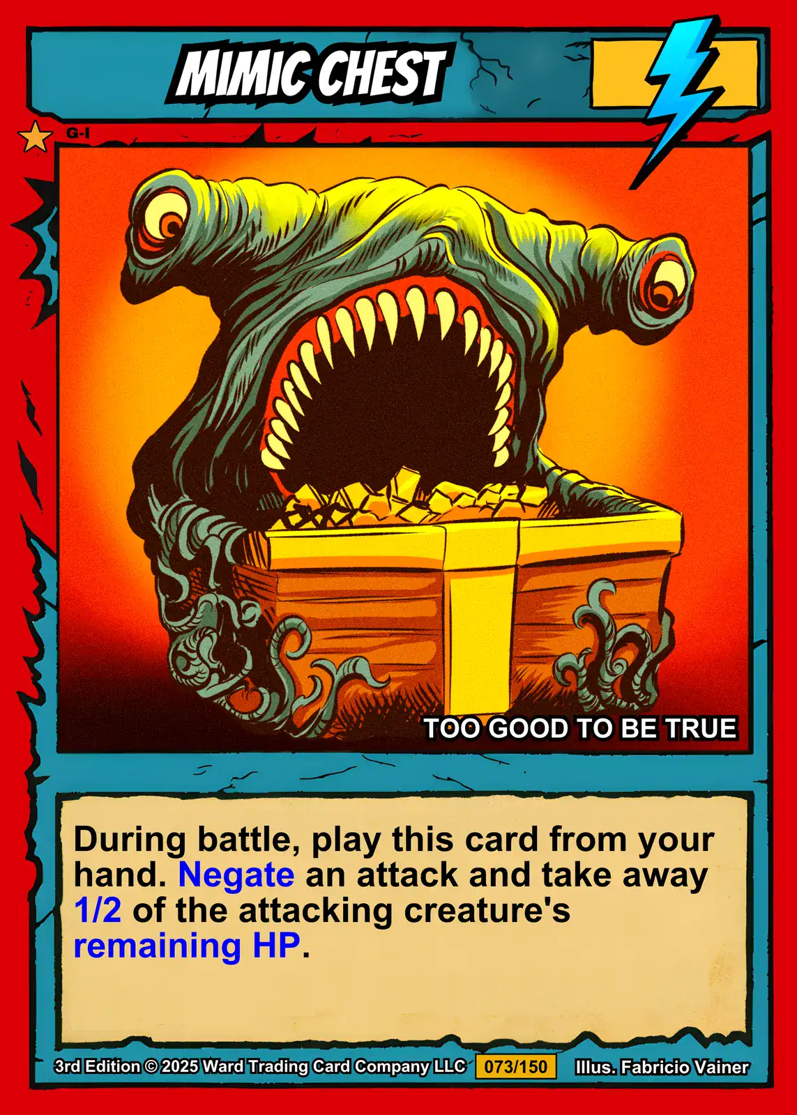 Equally, the orange-to-yellow gradient background radiates light behind the creature’s menacing form. The cyan header banner and beige text box frame the artwork with classic TCG design elements. Blue torn-paper borders complete the authentic Ward card layout.
