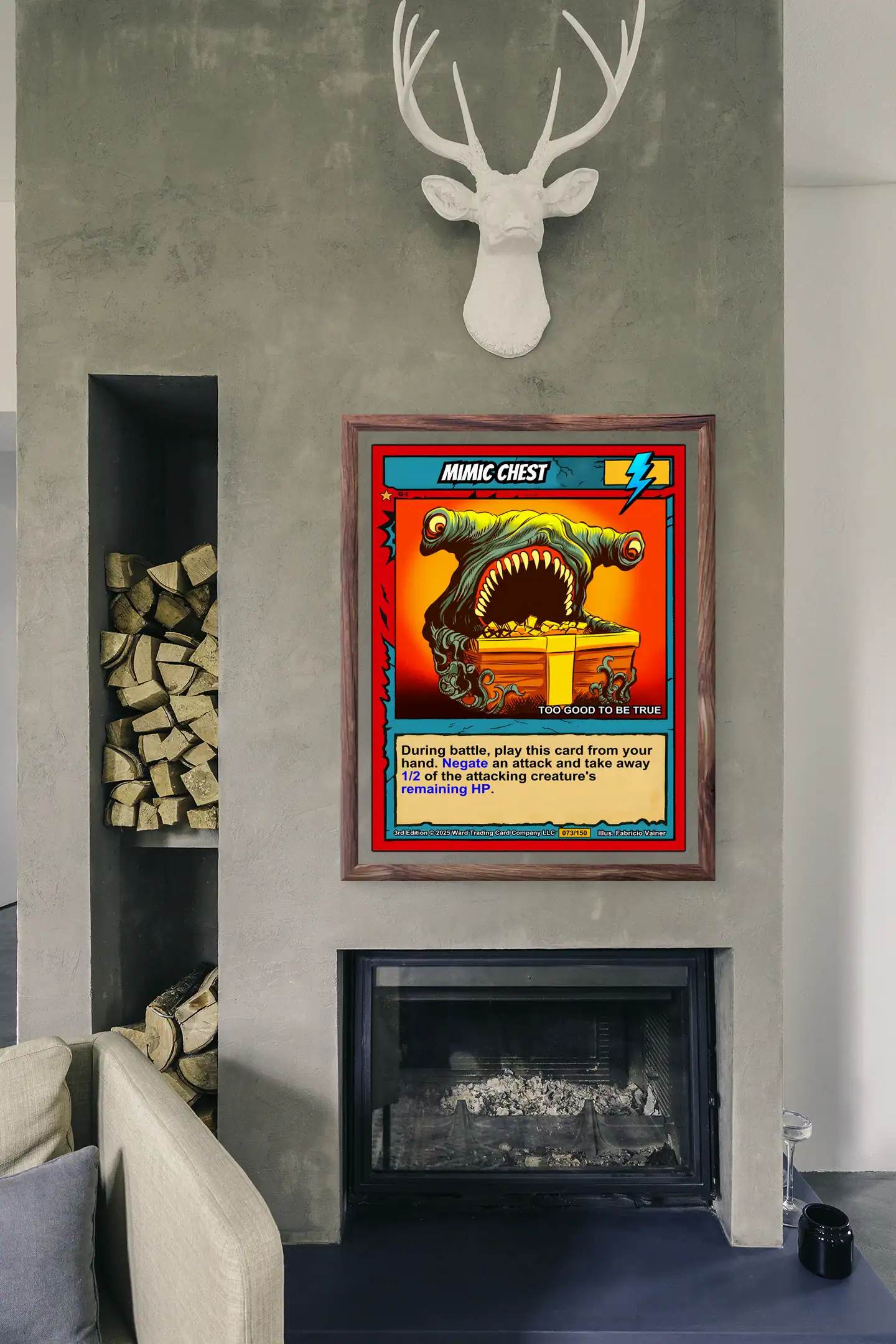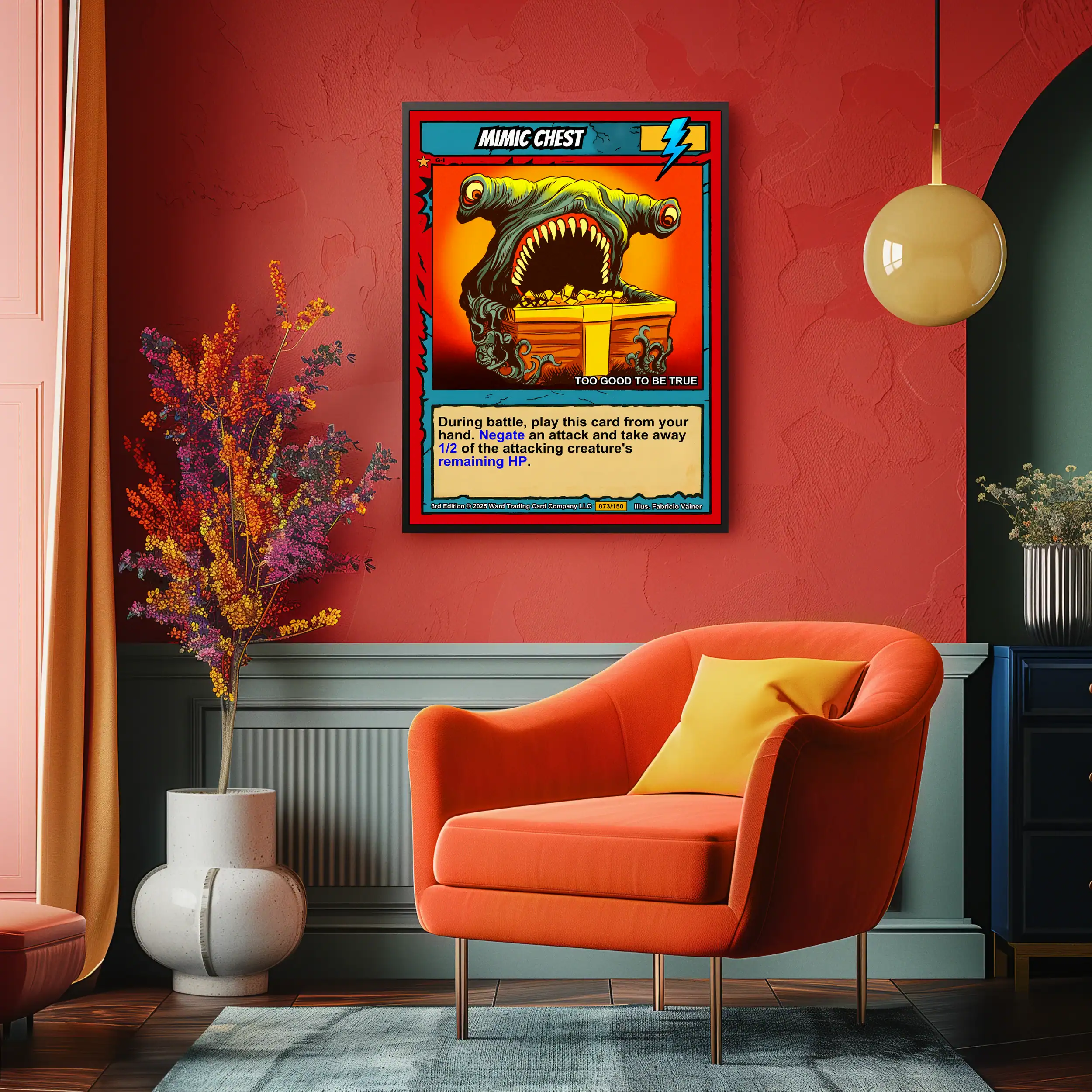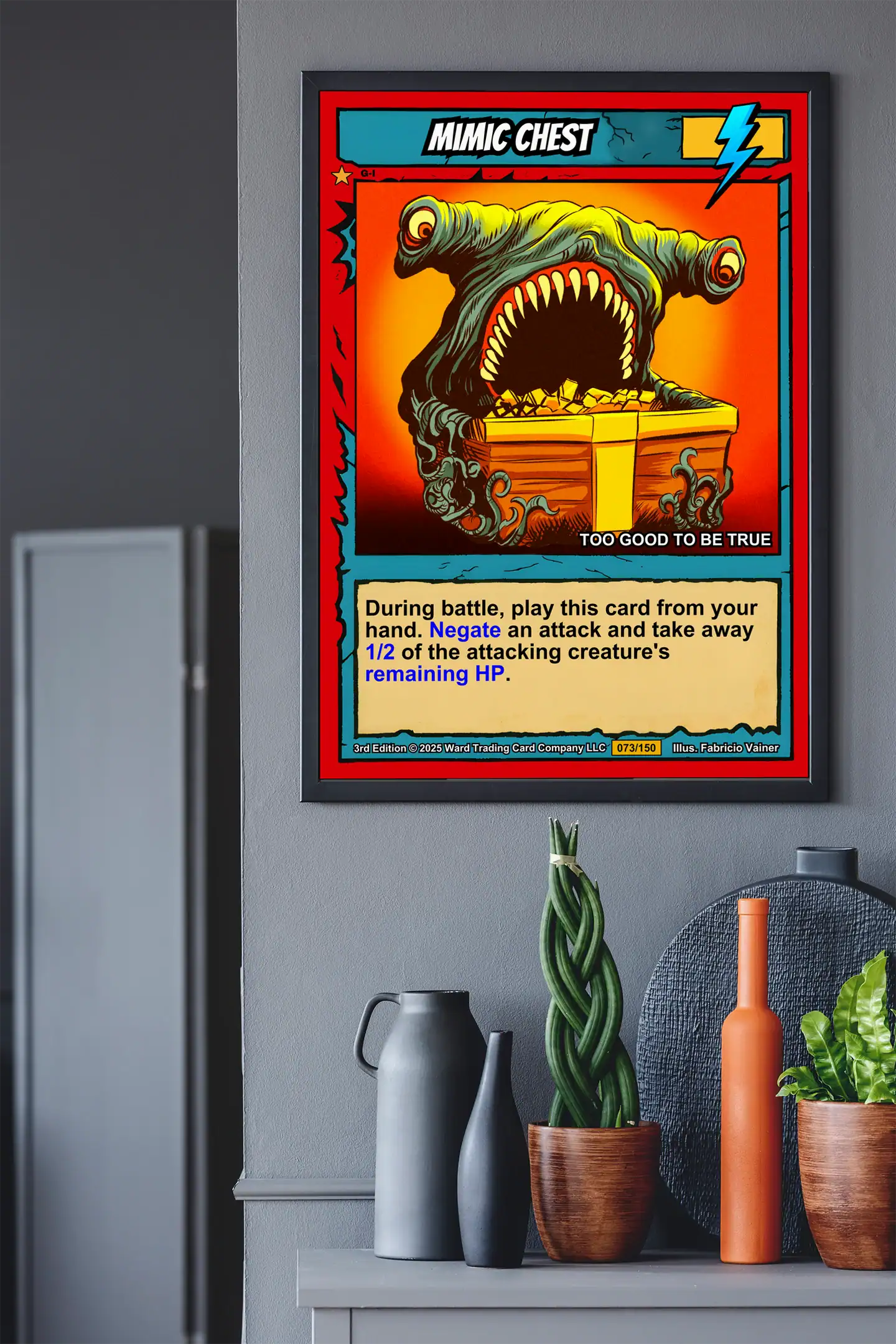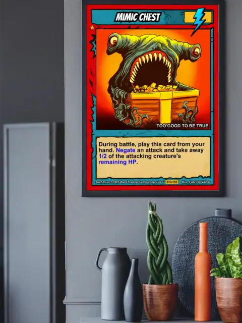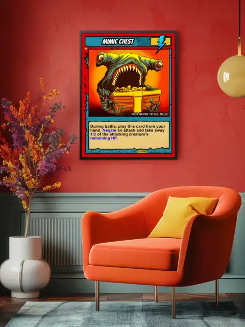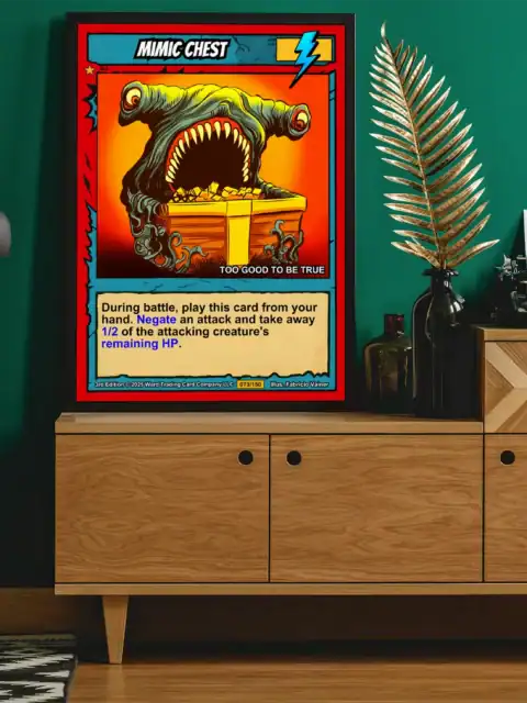 DMs running dungeon crawls need visual reminders of classic monster encounters. TCG collectors appreciate Vainer’s cel-shaded artistry and the Casey brothers’ creature design philosophy. Moreover, this mimic chest trading card canvas print delivers nostalgic 1990s fantasy gaming atmosphere.