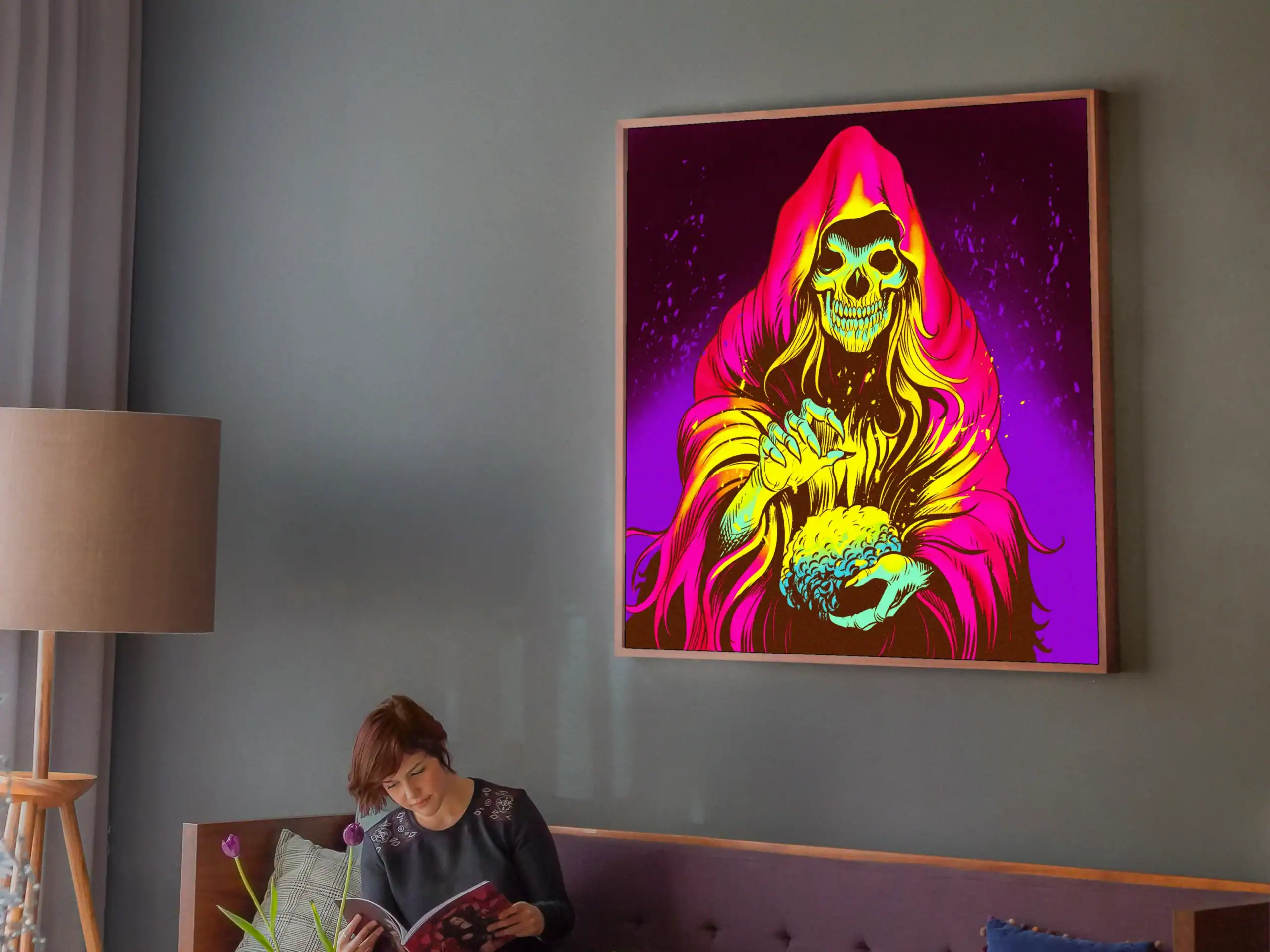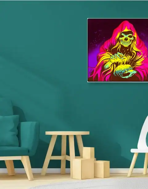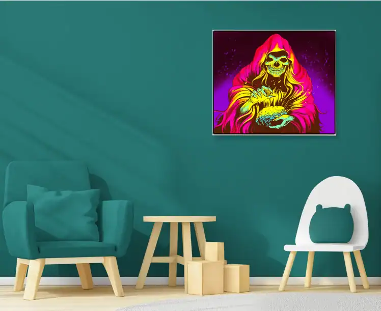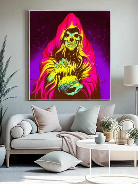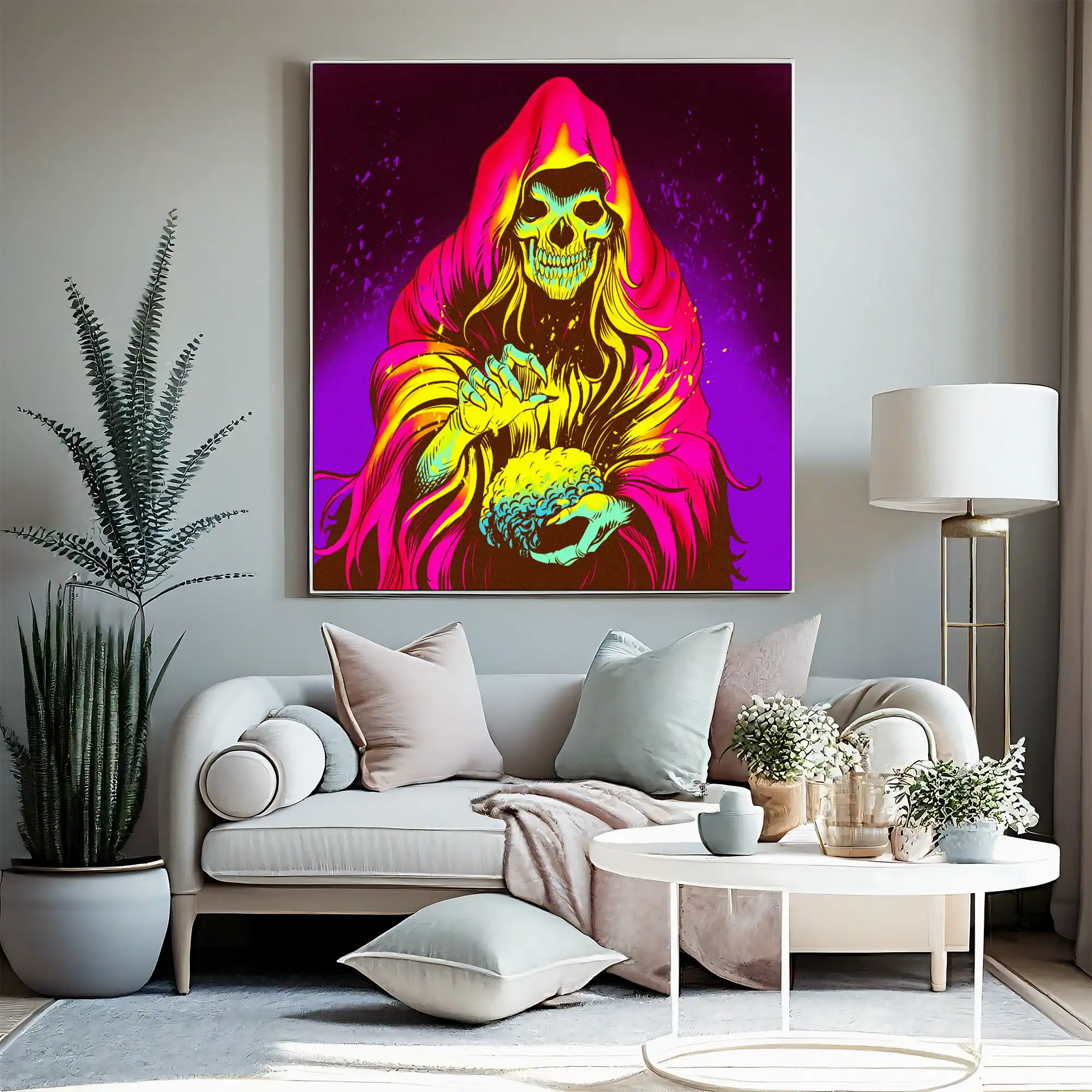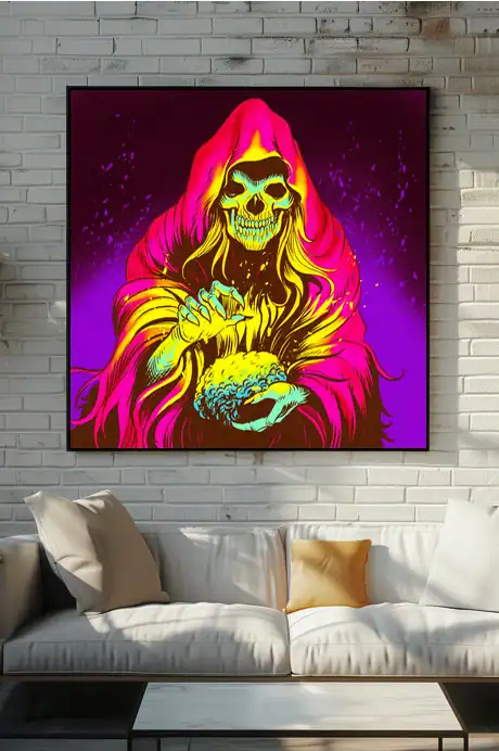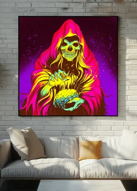 Creative studios and gaming dens gain intensity from this neon-drenched skeletal psychic. Furthermore, the bold contrast cuts through ambient lighting with unwavering presence.