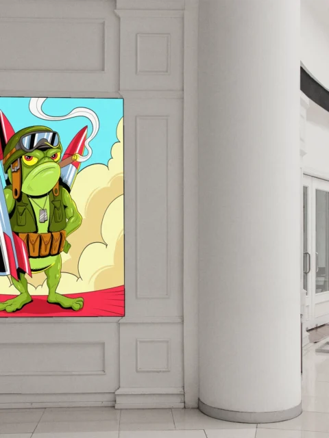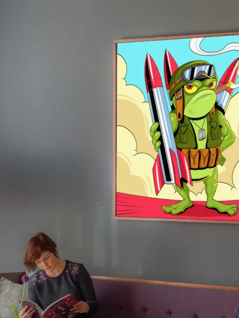 An anthropomorphic frog stands armed with red-tipped missiles and combat gear. This missile toad art trading card art canvas print captures Fabricio Vainer’s bold comic illustration style. The character wears aviator goggles and grips a cigar, notably projecting military swagger.