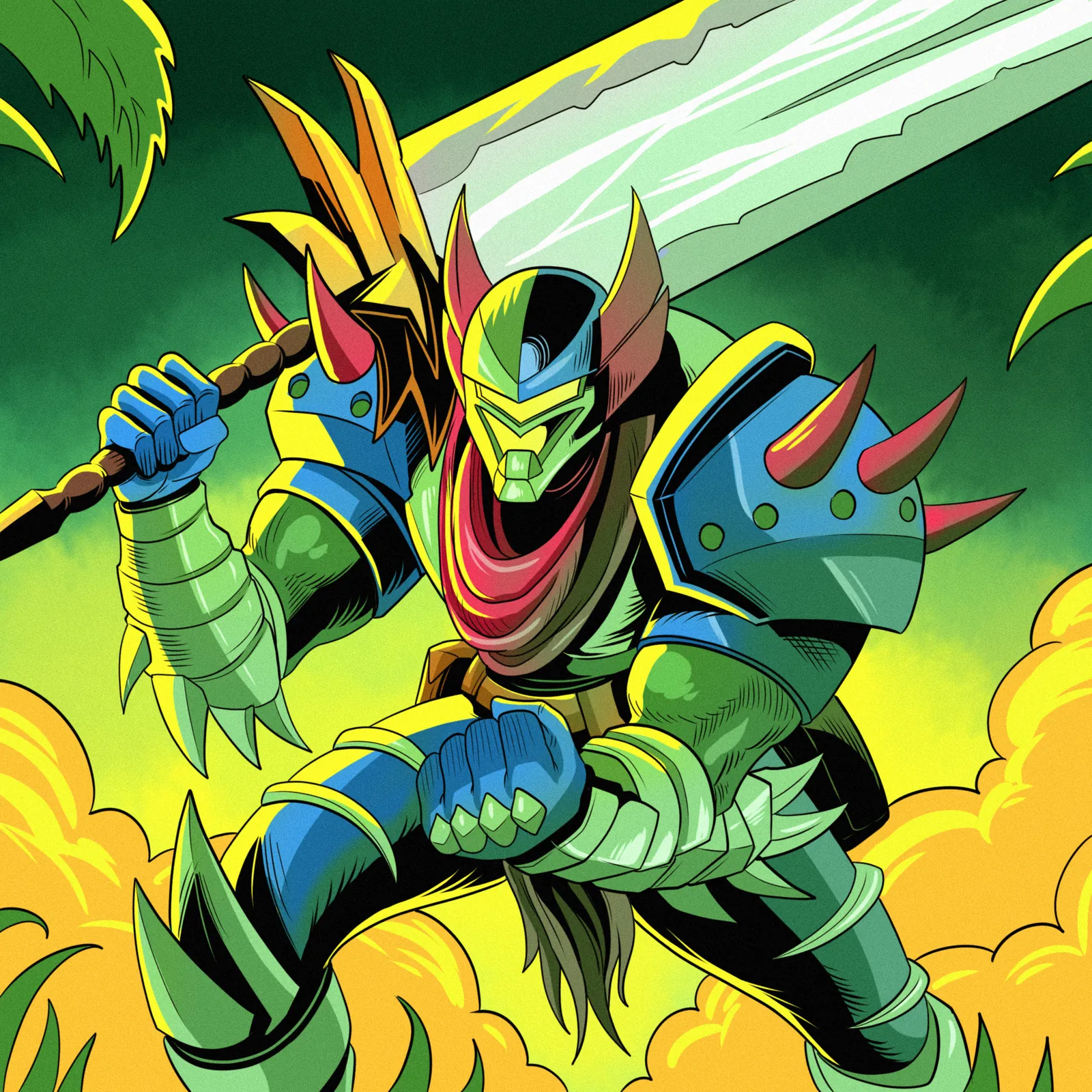 Additionally, the green and yellow armor plates contrast against dark upper tones and bright yellow-green lower fields. Orange-yellow smoke effects anchor the bottom third of the composition. Moreover, thick black outlines and flat color fills create cel-shaded comic book intensity.