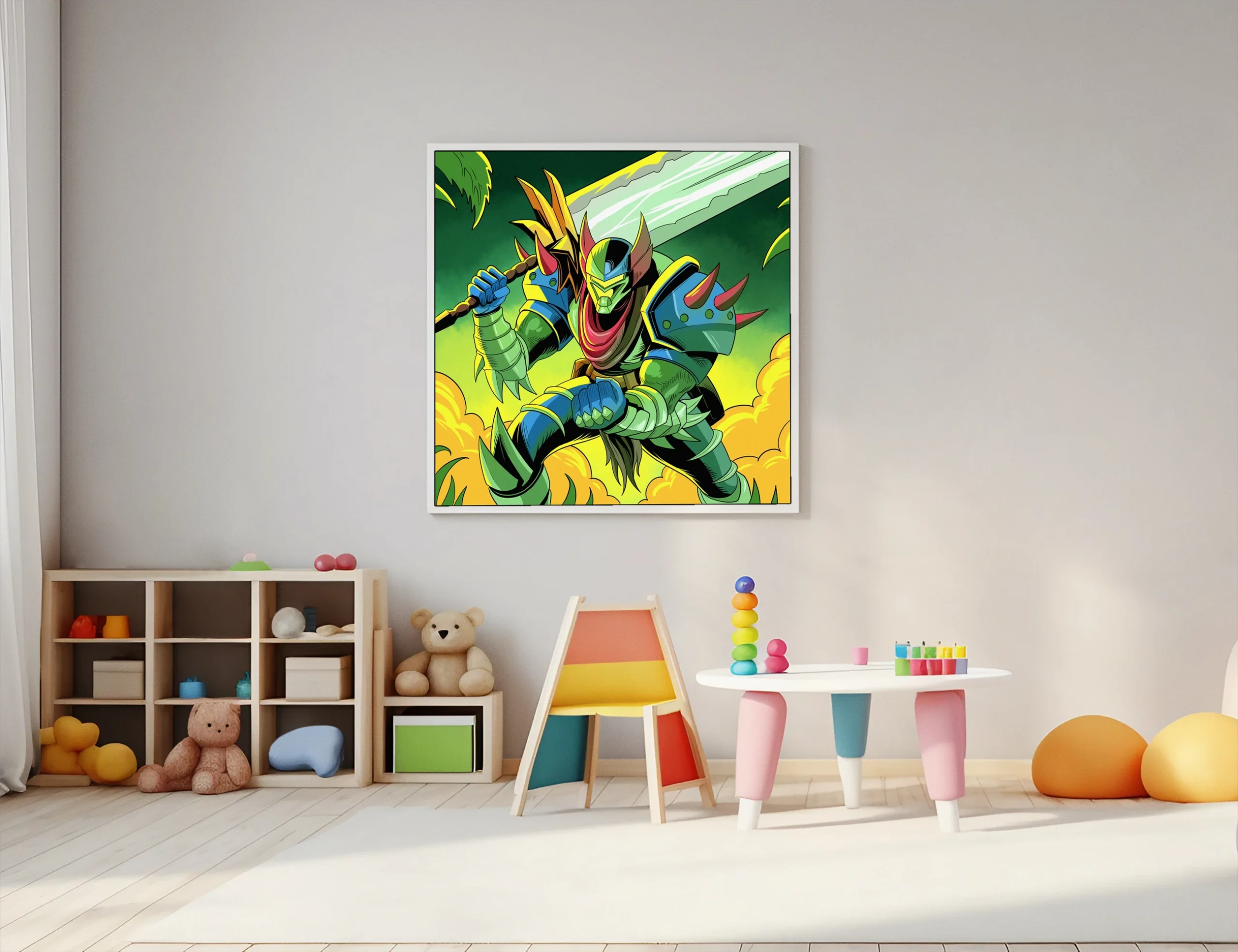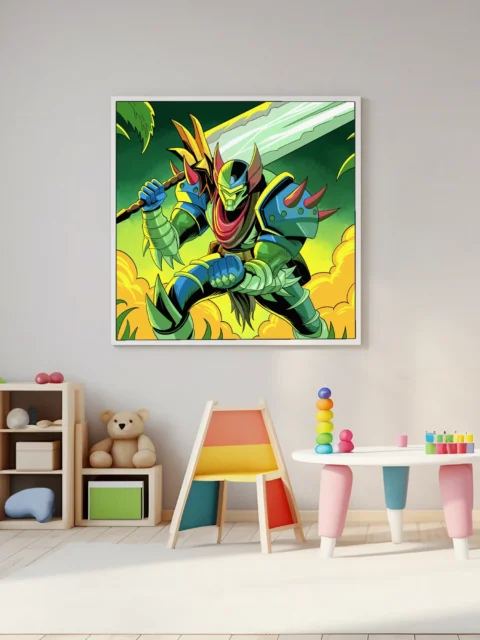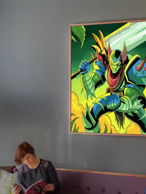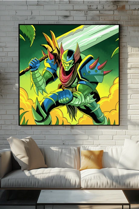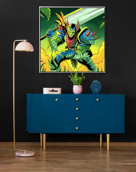 Game rooms and collector walls benefit from the heroic energy and action-forward composition. Additionally, the bold color palette holds visibility across large open spaces without fading into background noise.