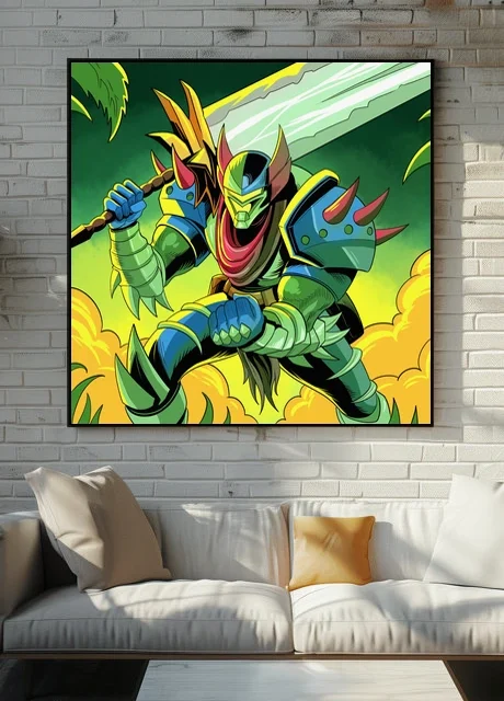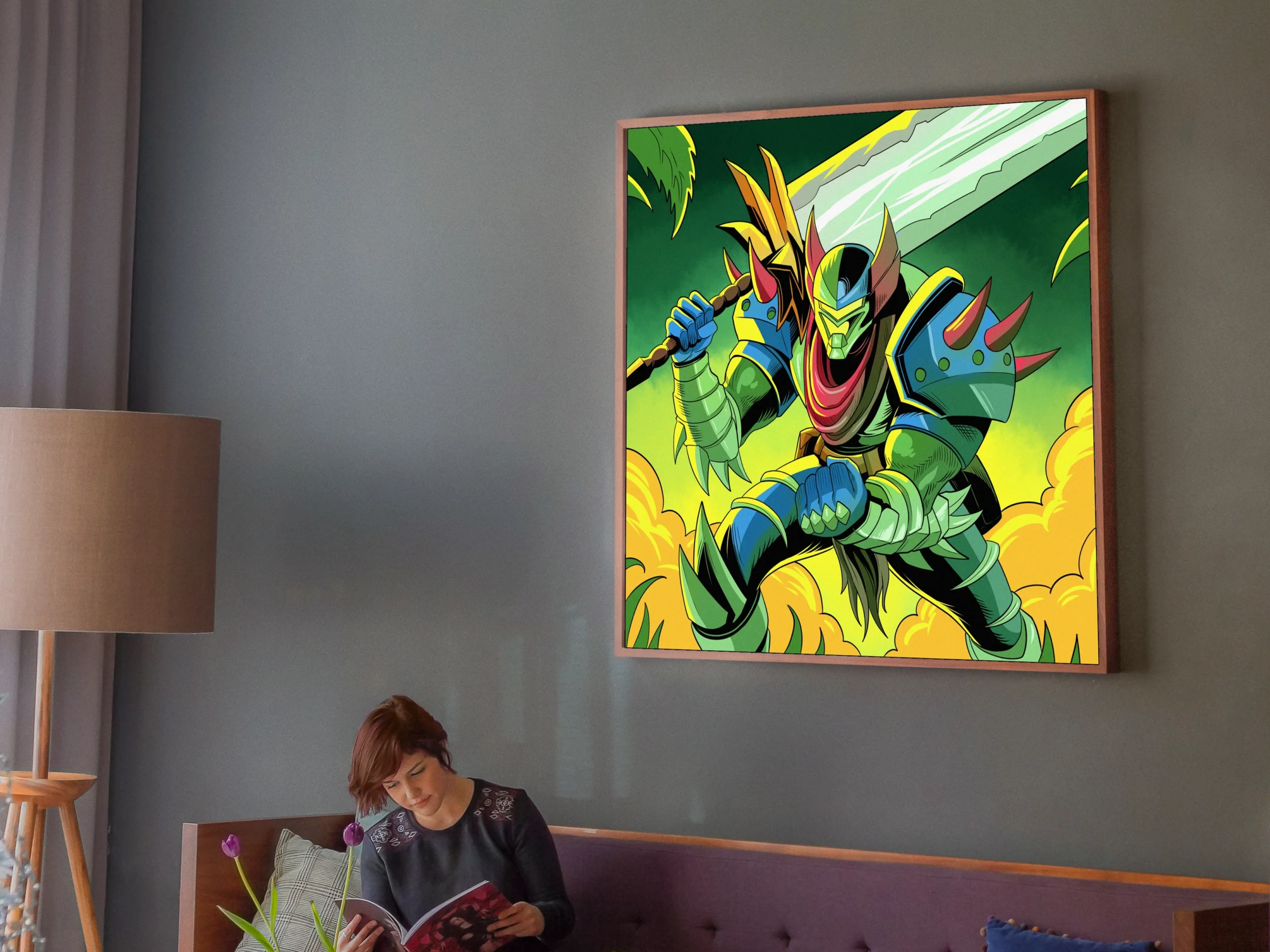 On the wall, the blade’s diagonal sweep and color saturation command immediate attention. Ward TCG collectors and comic art enthusiasts gain a gallery-ready piece without card borders. This monster armor art trading card art canvas print delivers pure Vainer illustration at display scale.