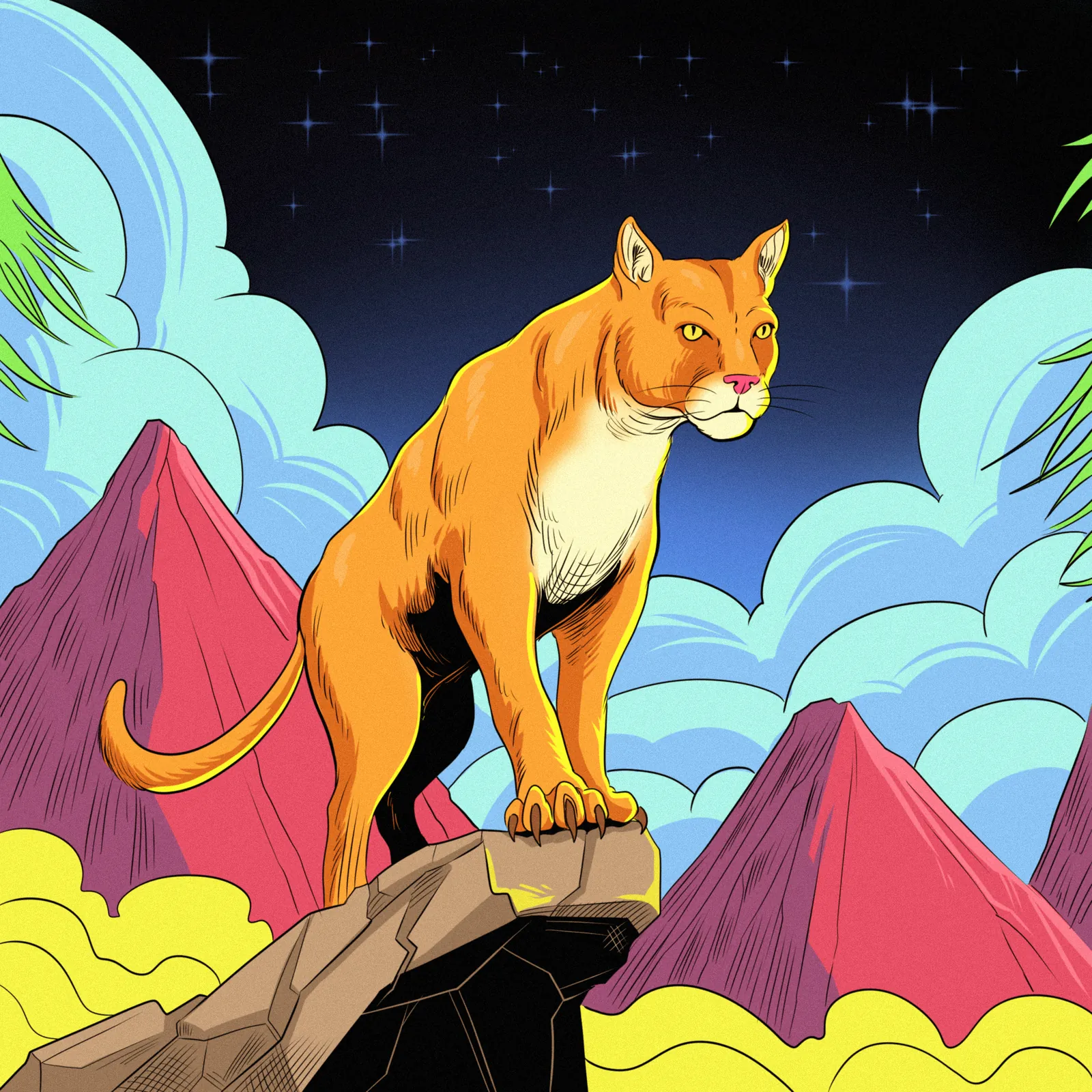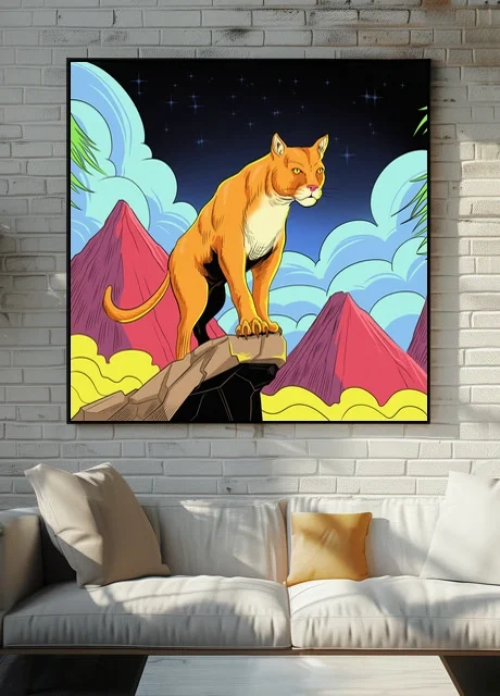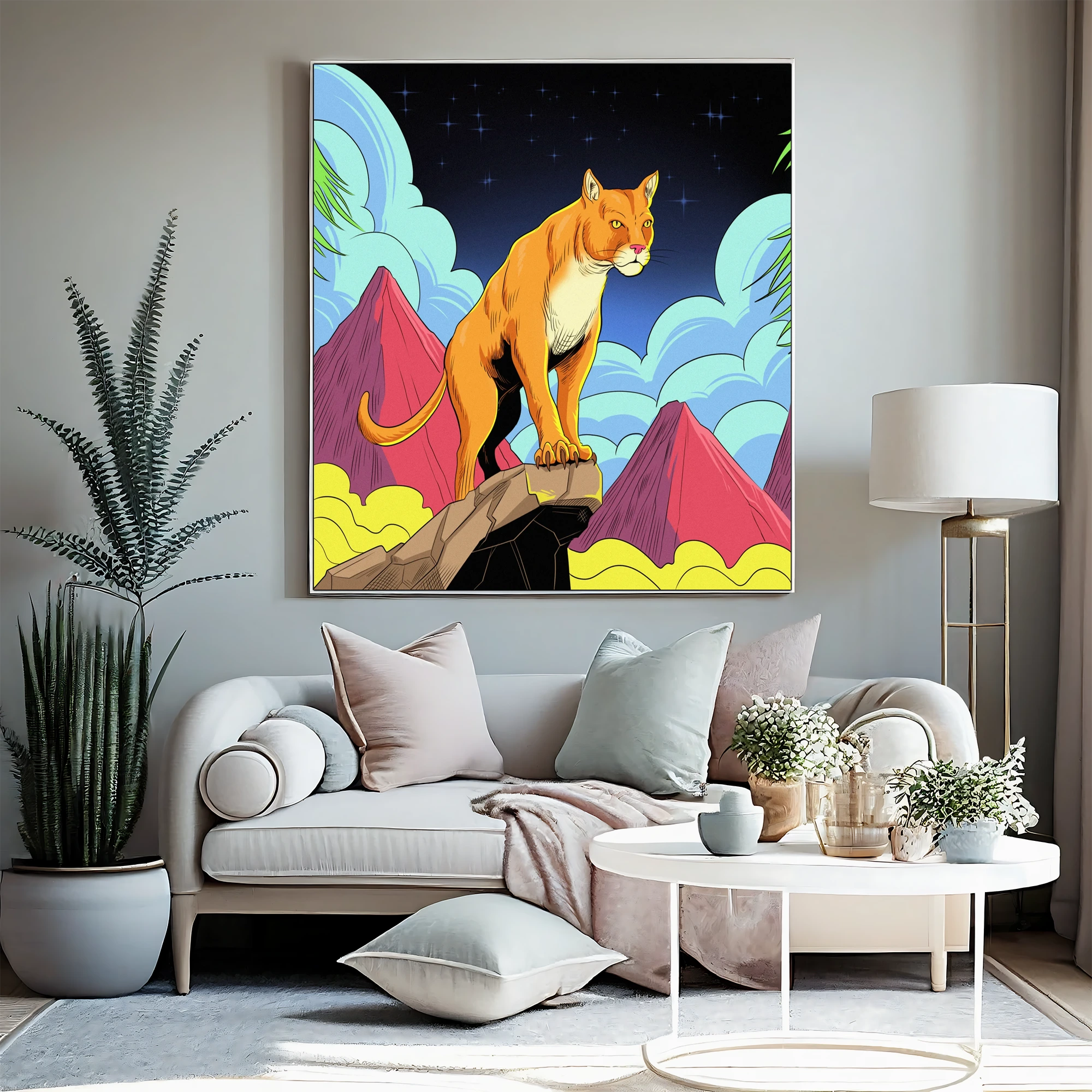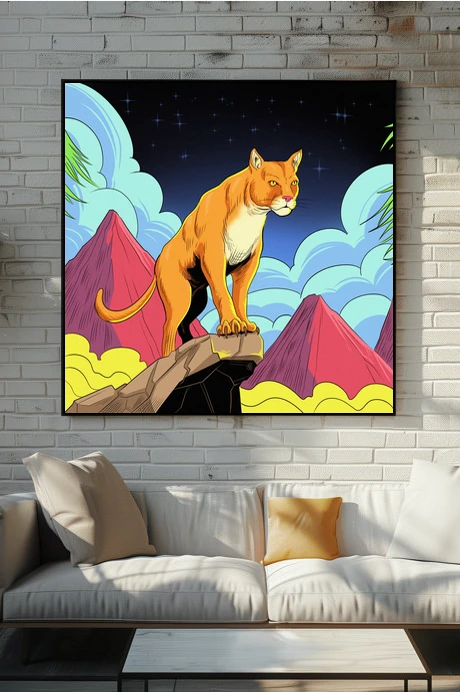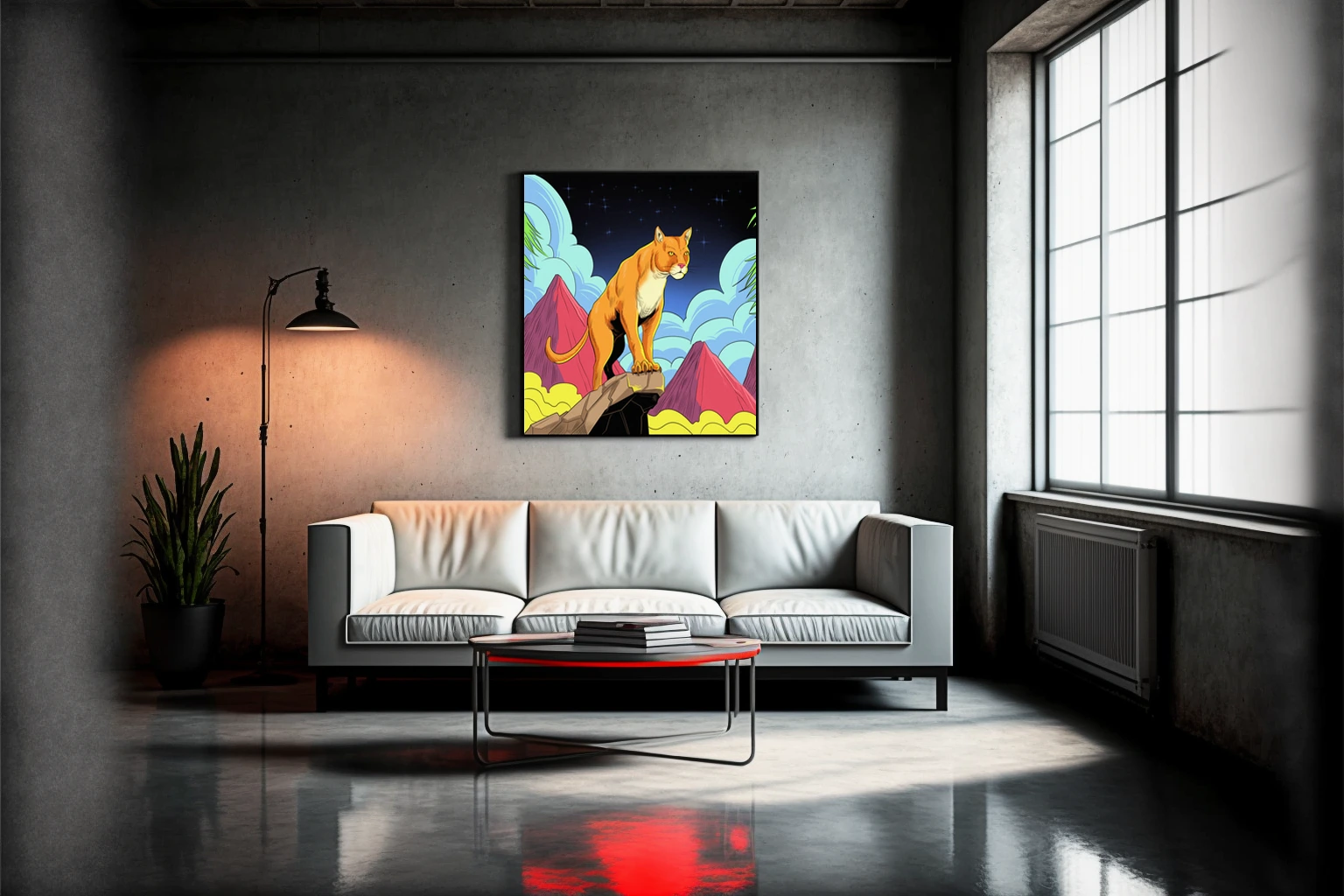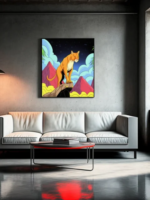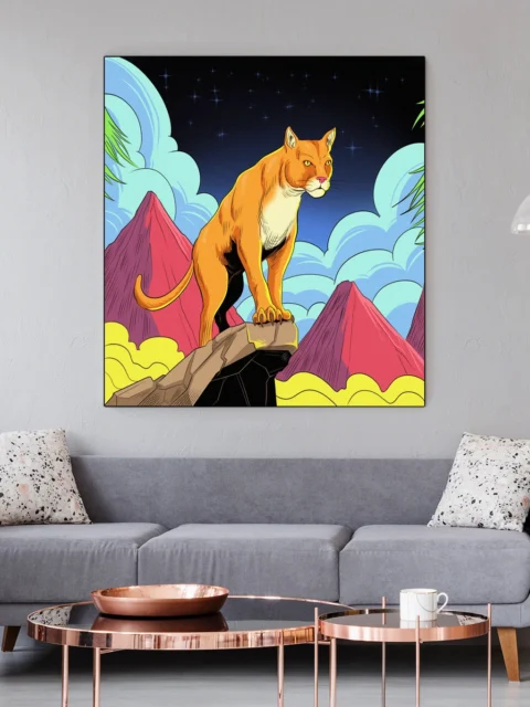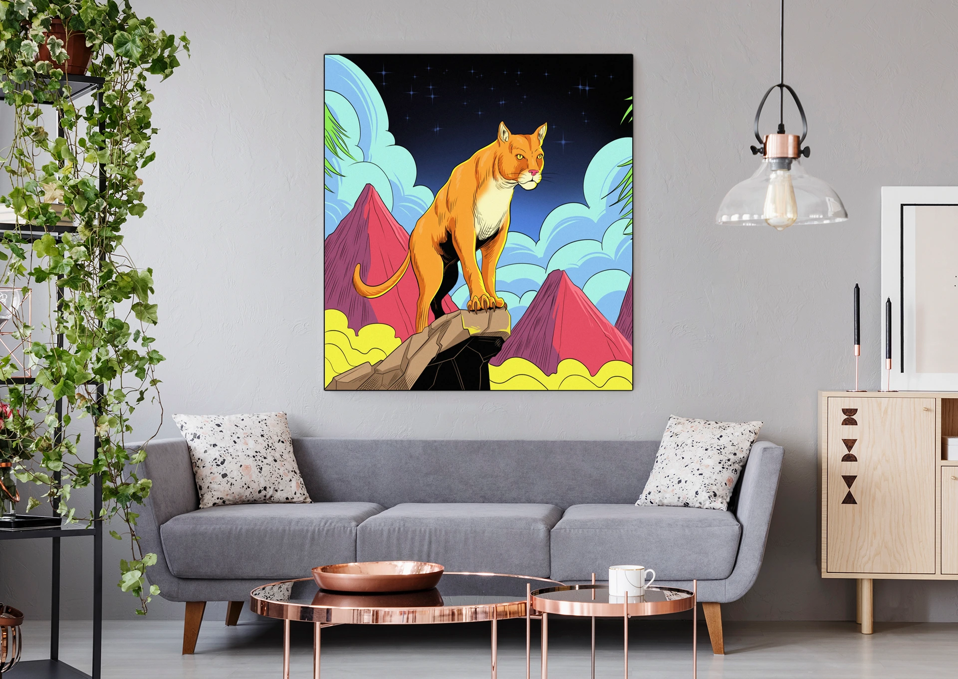 A muscular mountain lion stands alert on a rocky outcrop. This montain lion art trading card art canvas print showcases Fabricio Vainer’s bold digital illustration. The creature’s golden-orange coat features defined black linework, notably against deep navy sky.