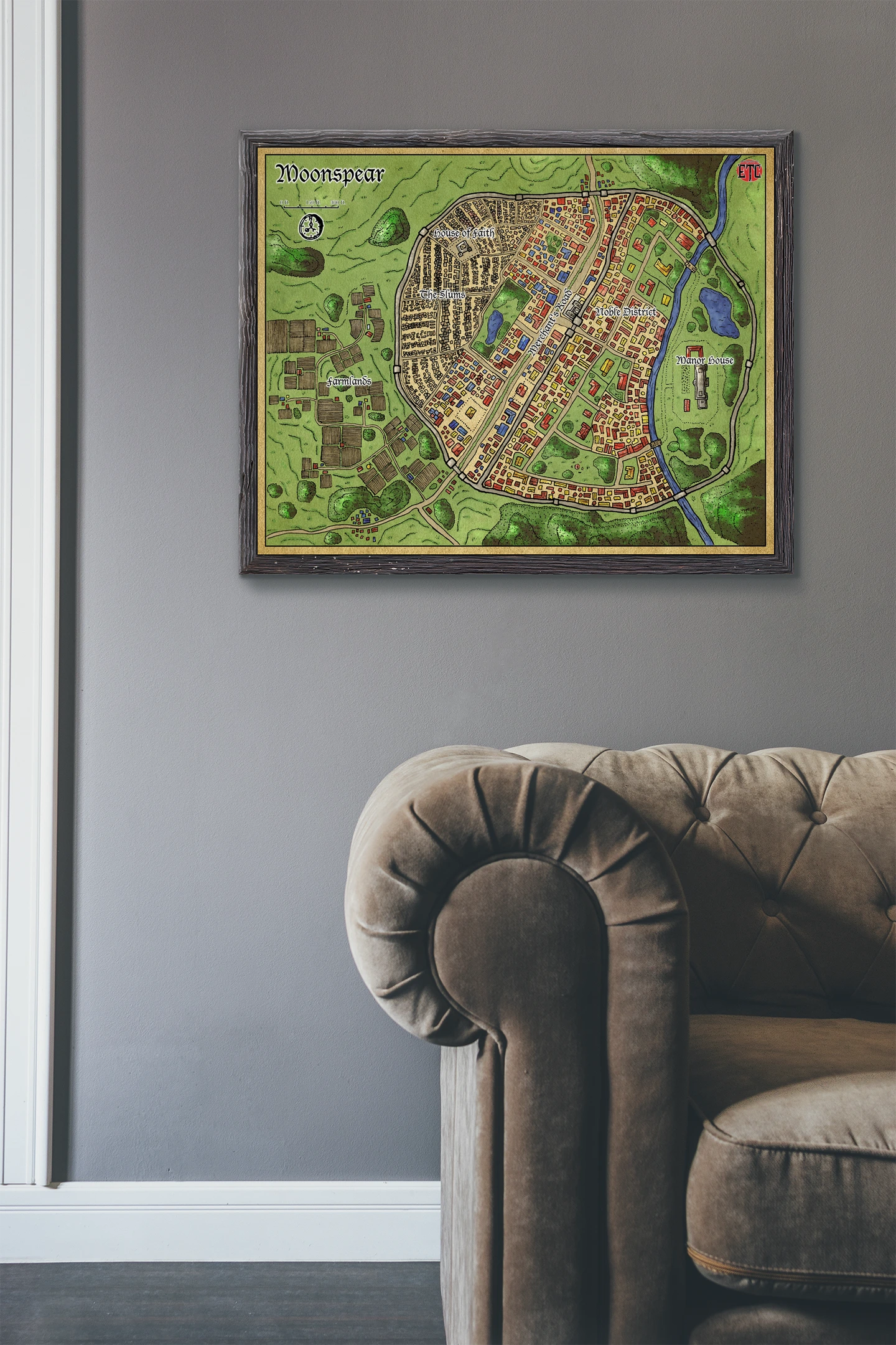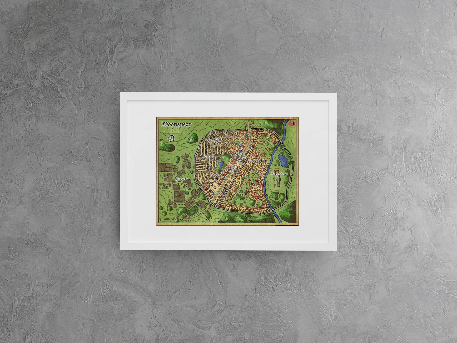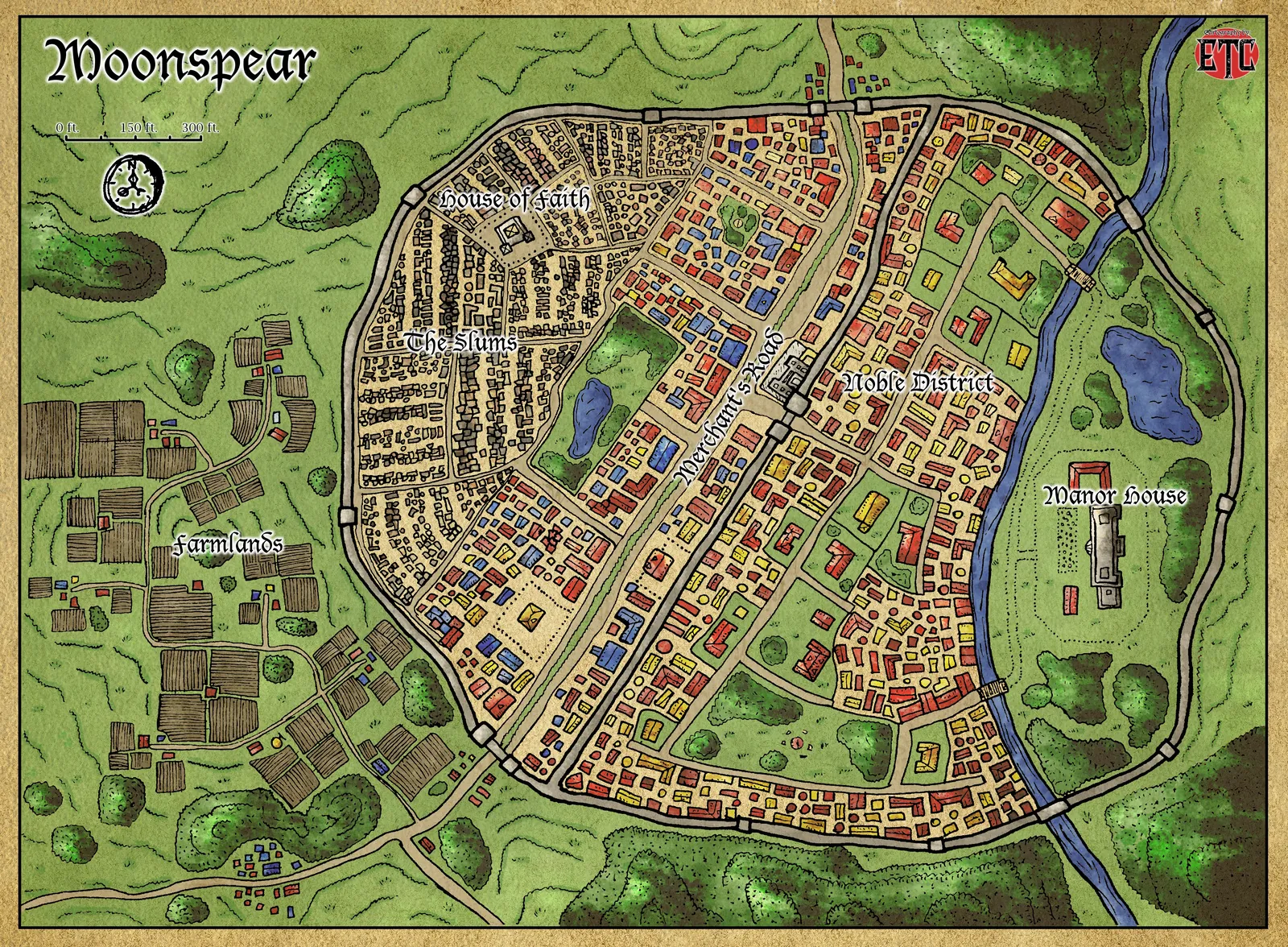 A walled city divides into five labeled districts across hundreds of red and tan building footprints. This moonspear fantasy battle map canvas print shows the House of Faith, Slums, Merchants, Noble District. And Manor House sectors in hand-drawn detail. A blue river curves along the eastern wall while green farmlands spread west.