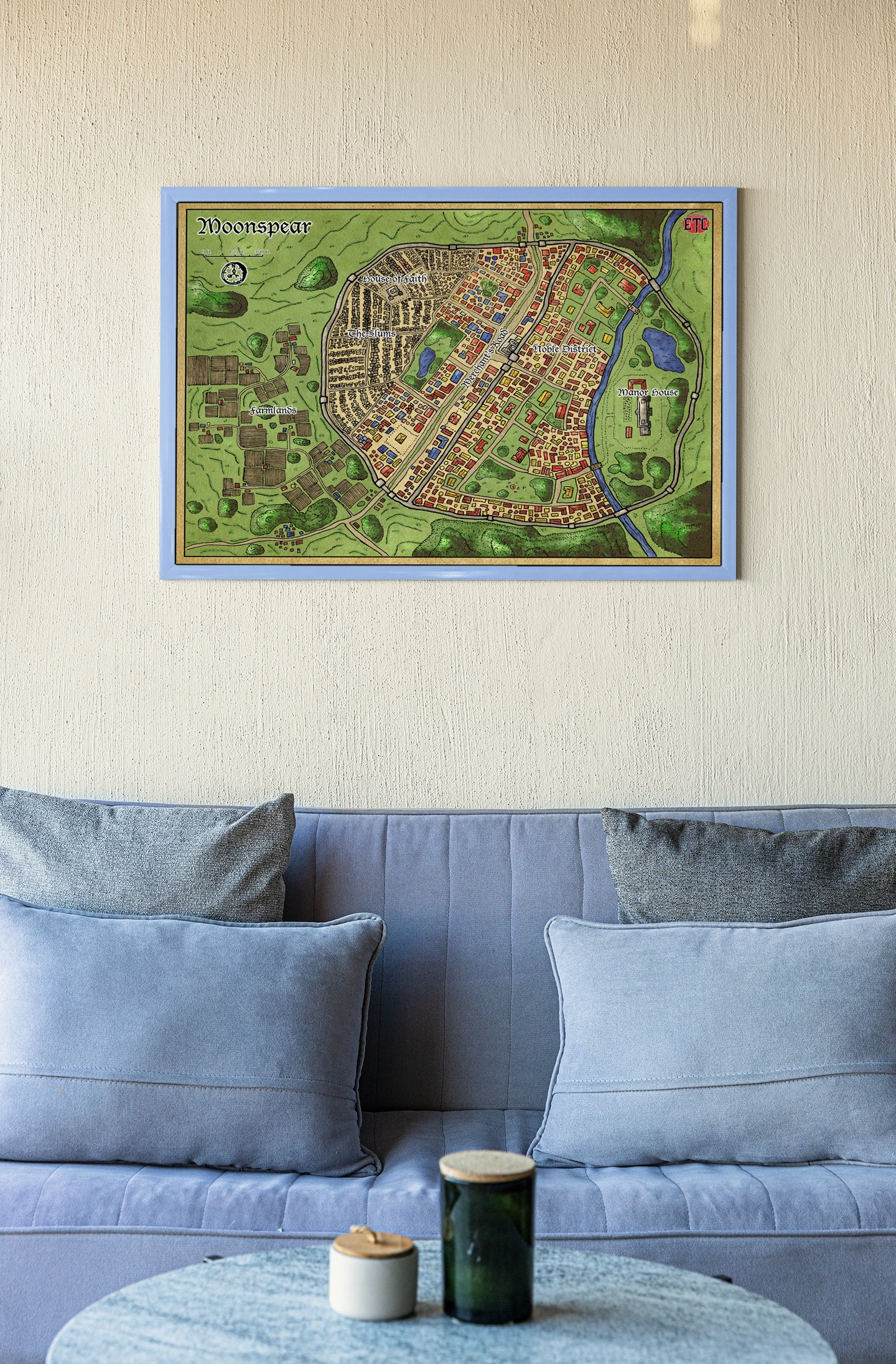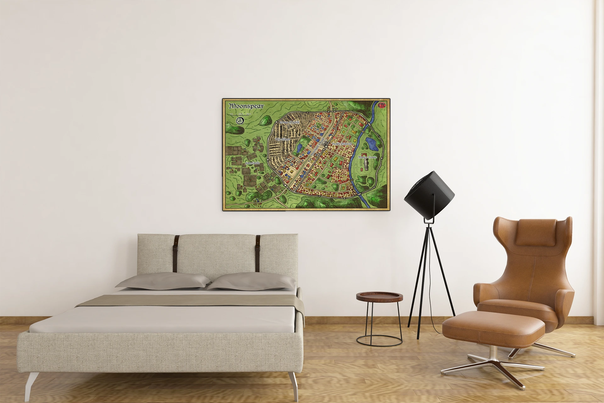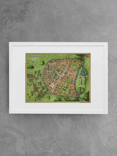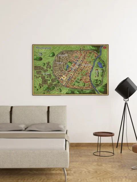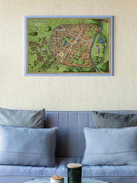This map gives a walled settlement the kind of district-level clarity most city maps skip. Dungeon masters running urban campaigns gain a reference that tracks faction territories and movement paths session to session. The moonspear fantasy battle map canvas print holds campaign geography particularly well for groups returning to the same location.