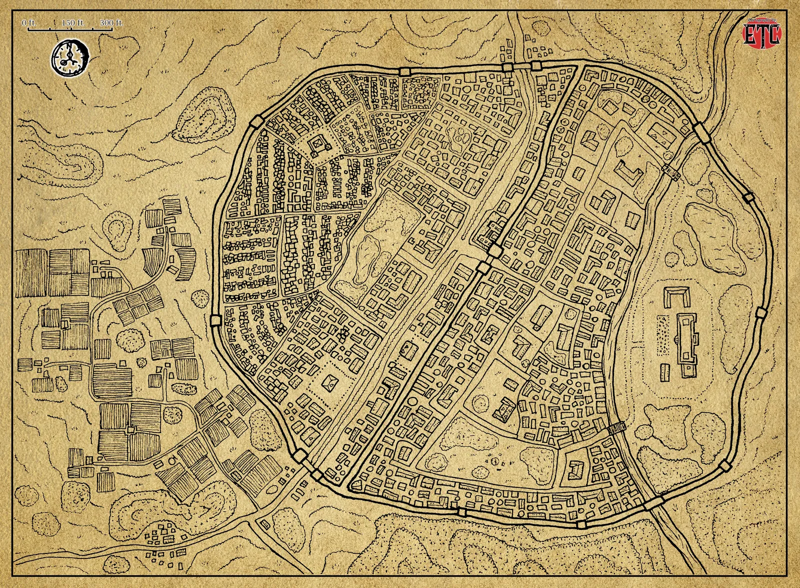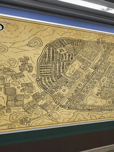 Visible behind the DM screen during every session. The unlabeled districts let you name neighborhoods as the party discovers them. Moreover, the street-level detail supports chase scenes and faction territory without locking in canonical names.