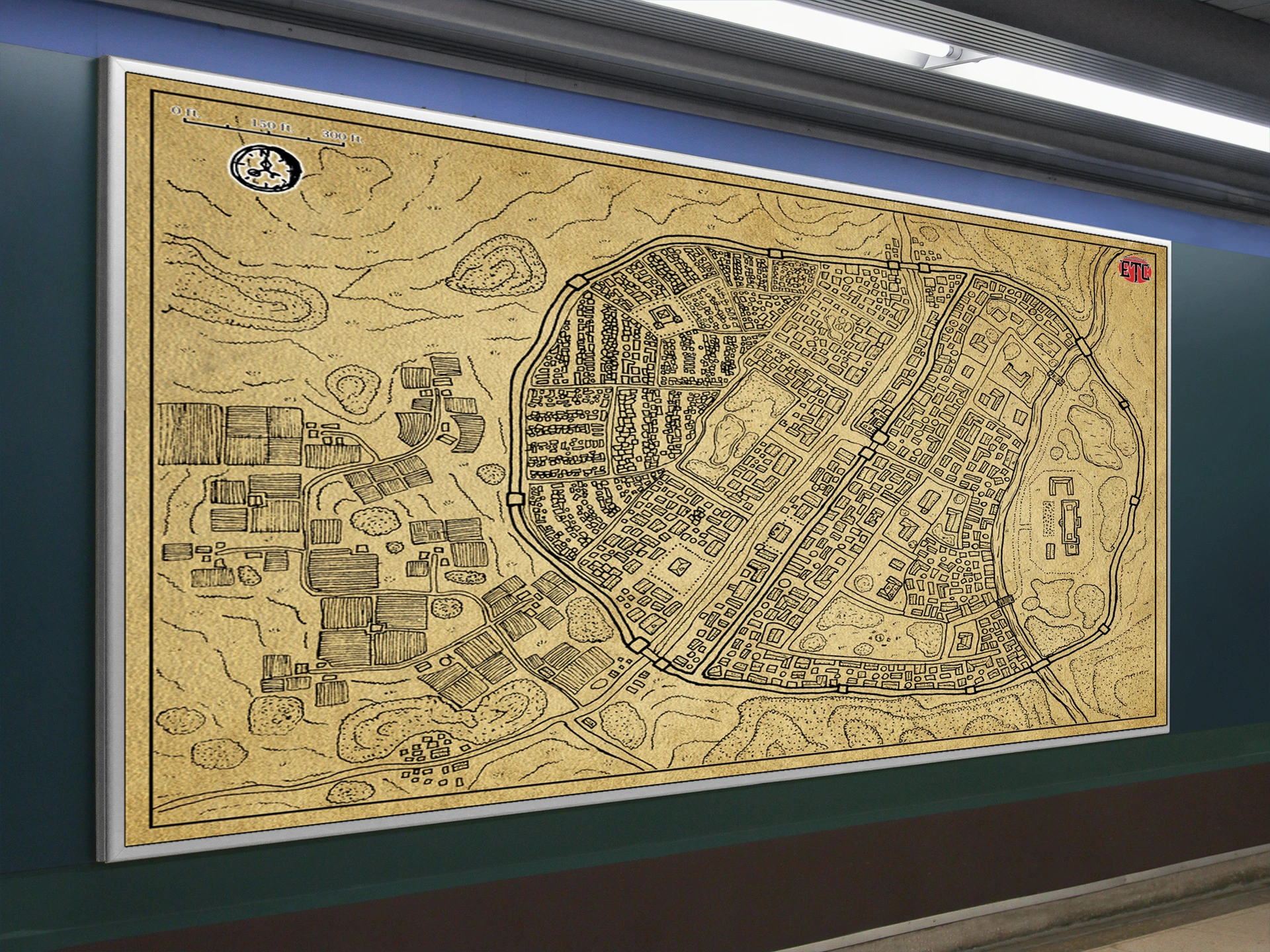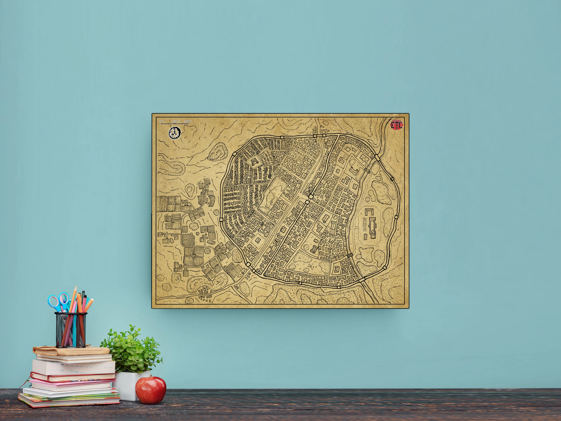 A walled city fills the frame in sepia ink and parchment tones. This moonspear parchment no labels fantasy battle map canvas print shows dense western quarters tapering to eastern compounds. Notably, the compass rose and scale bar anchor the cartographic presentation.