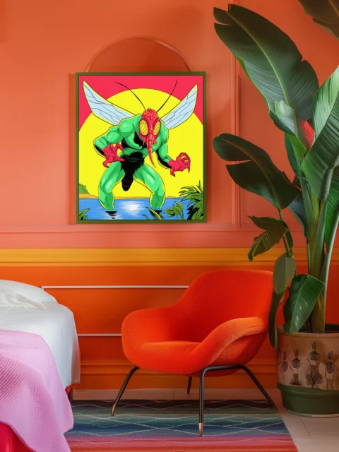 On the wall, the campy menace reads larger and more absurd than card scale allows. Ward TCG collectors and creature design enthusiasts gain a conversation piece that bridges horror nostalgia and fantasy art. This moskito man art trading card art canvas print delivers retro pulp energy without irony.