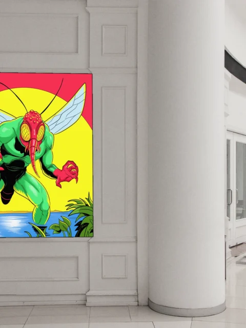 A muscular humanoid mosquito creature towers over a blue pond with clawed hands extended. This moskito man art trading card art canvas print captures Fabricio Vainer’s bold comic book illustration style. The figure features translucent pale blue wings with visible vein patterns, notably detailed.