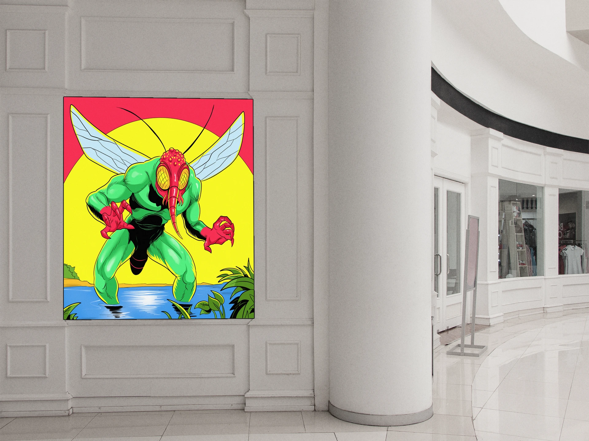 Additionally, the color palette contrasts a bright green insectoid body against a hot pink magenta sky. A large yellow sun sits centered behind the creature’s red head and compound eyes. The heavy black outlines and flat colors also evoke vintage pulp horror magazine aesthetics.