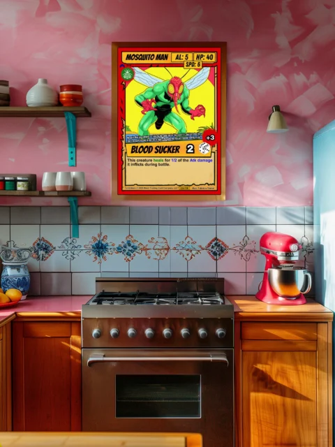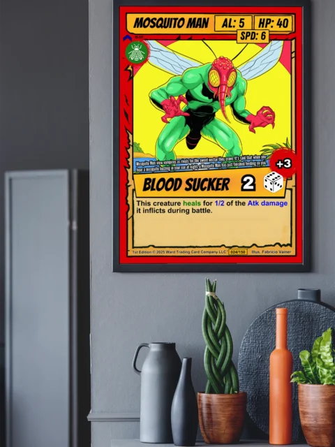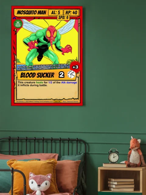 The comic book style reads clearly from across the room. This mosquito man trading card canvas print appeals to Ward TCG collectors and trading card game enthusiasts. Indeed, the BLOOD SUCKER ability text and flavor lore about vampire rivalry add authentic card detail.