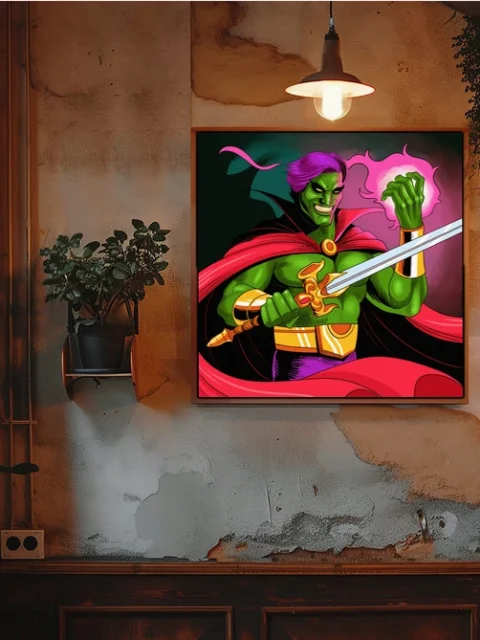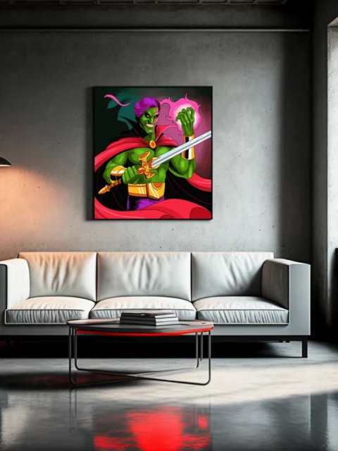 A green-skinned villain brandishes an ornate sword while channeling pink mystical energy. This mr evil art trading card art canvas print showcases Fabricio Vainer’s bold comic book illustration style. Notably, the character’s menacing grin and glowing yellow eyes dominate the composition.