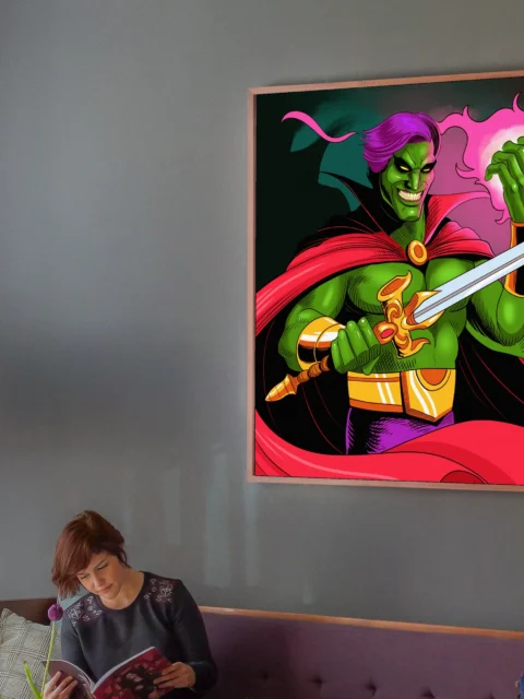 Display in game rooms alongside other villain-themed artwork or comic book illustration collections. Additionally, the saturated color scheme pairs well with modern gaming spaces and creative studios.