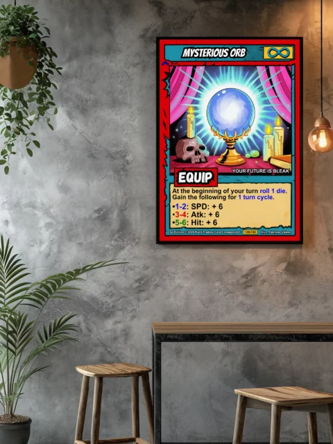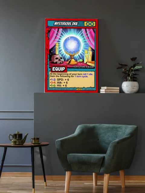 At room scale, the theatrical pink curtains and dramatic lighting create a fortune teller’s atmosphere. Collectors seeking Ward TCG equipment card artwork will recognize the EQUIP banner and edition details. This mysterious orb trading card canvas print works especially well in spaces where bold comic book linework stands out.
