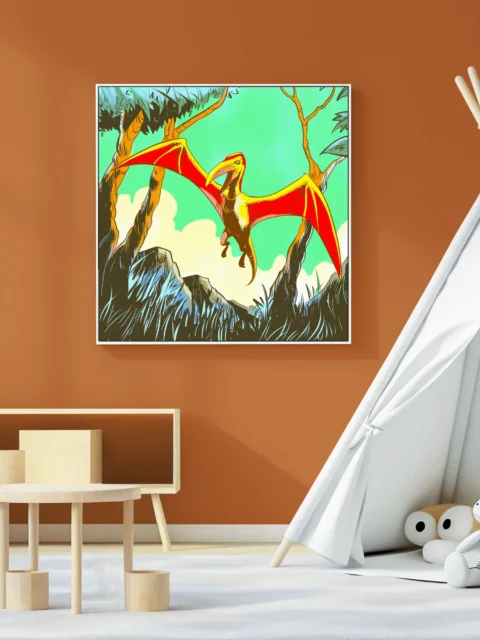 A pterosaur with crimson wing membranes soars through a prehistoric jungle canopy. This mythosaurus art trading card art canvas print presents Fabricio Vainer’s illustration in full gallery format. The creature’s curved beak and outstretched wings notably command the composition with retro pulp energy.