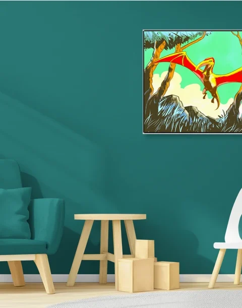 The composition anchors a game room wall where prehistoric creature art and retro illustration styles intersect. Additionally, the vibrant color scheme complements spaces dedicated to Ward TCG collections or vintage pulp aesthetics.
