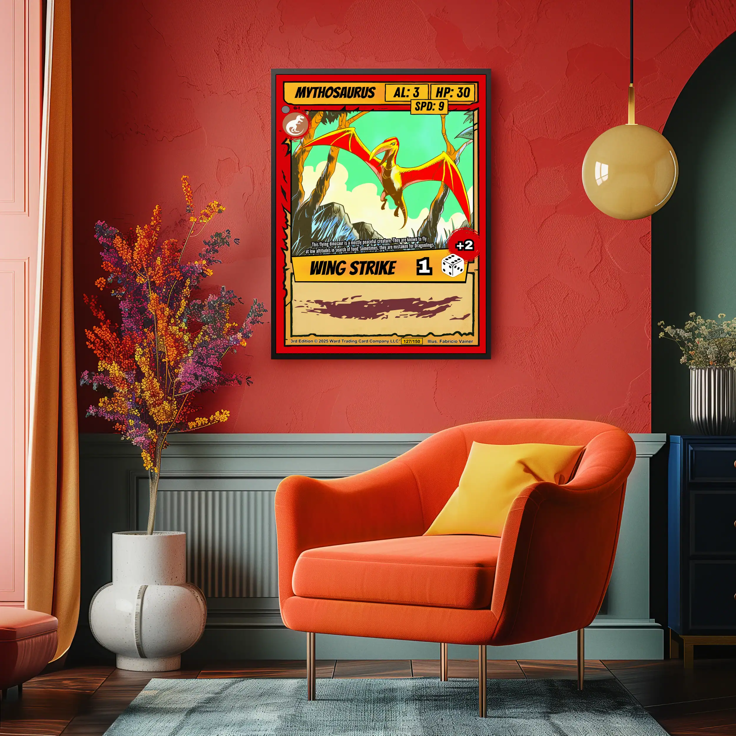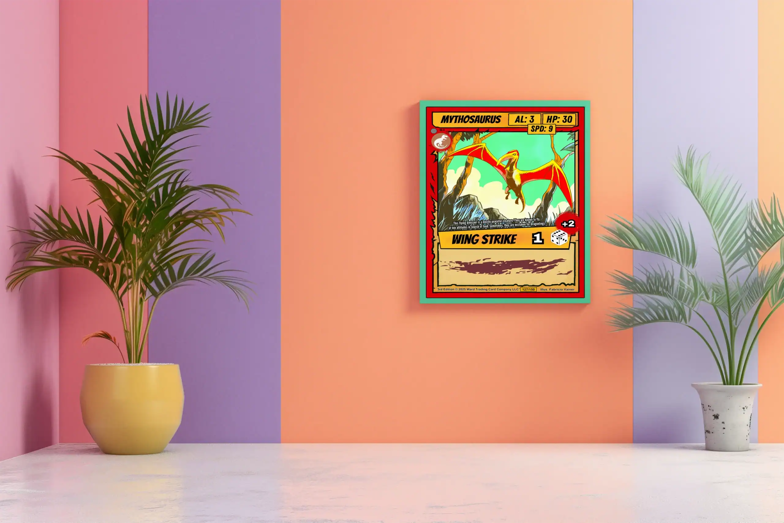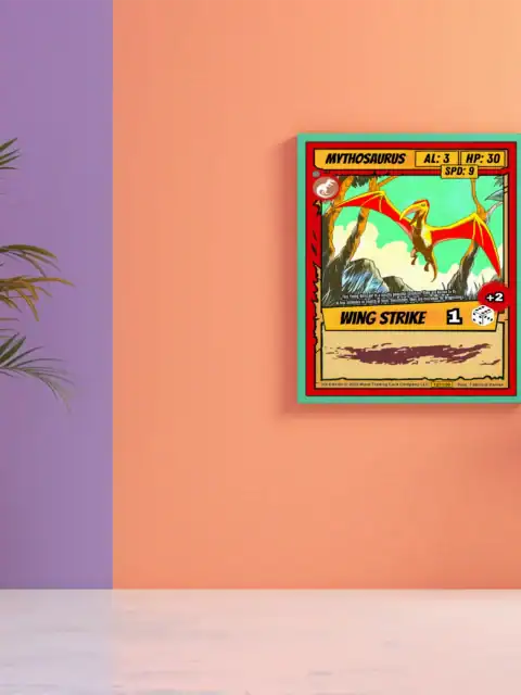 The Wing Strike ability notation reveals this as a speed-focused creature card. TCG collectors recognize Vainer’s signature cel-shading technique immediately. This mythosaurus trading card canvas print particularly appeals to Ward enthusiasts.