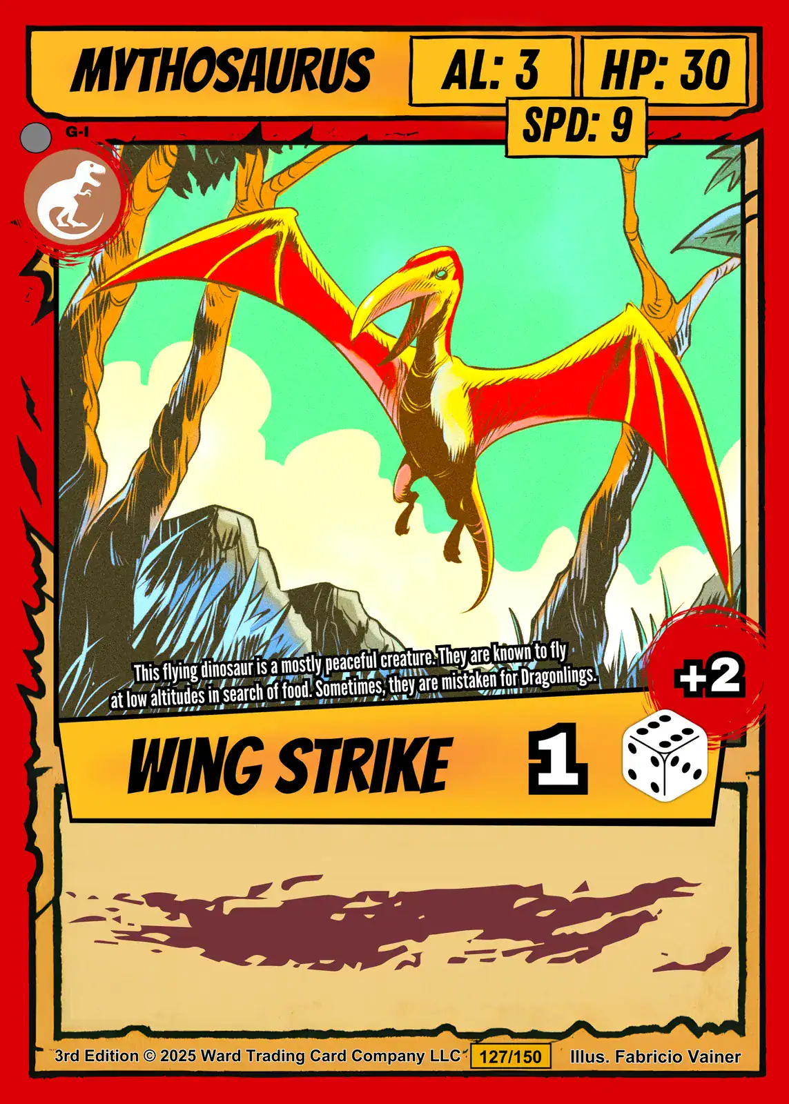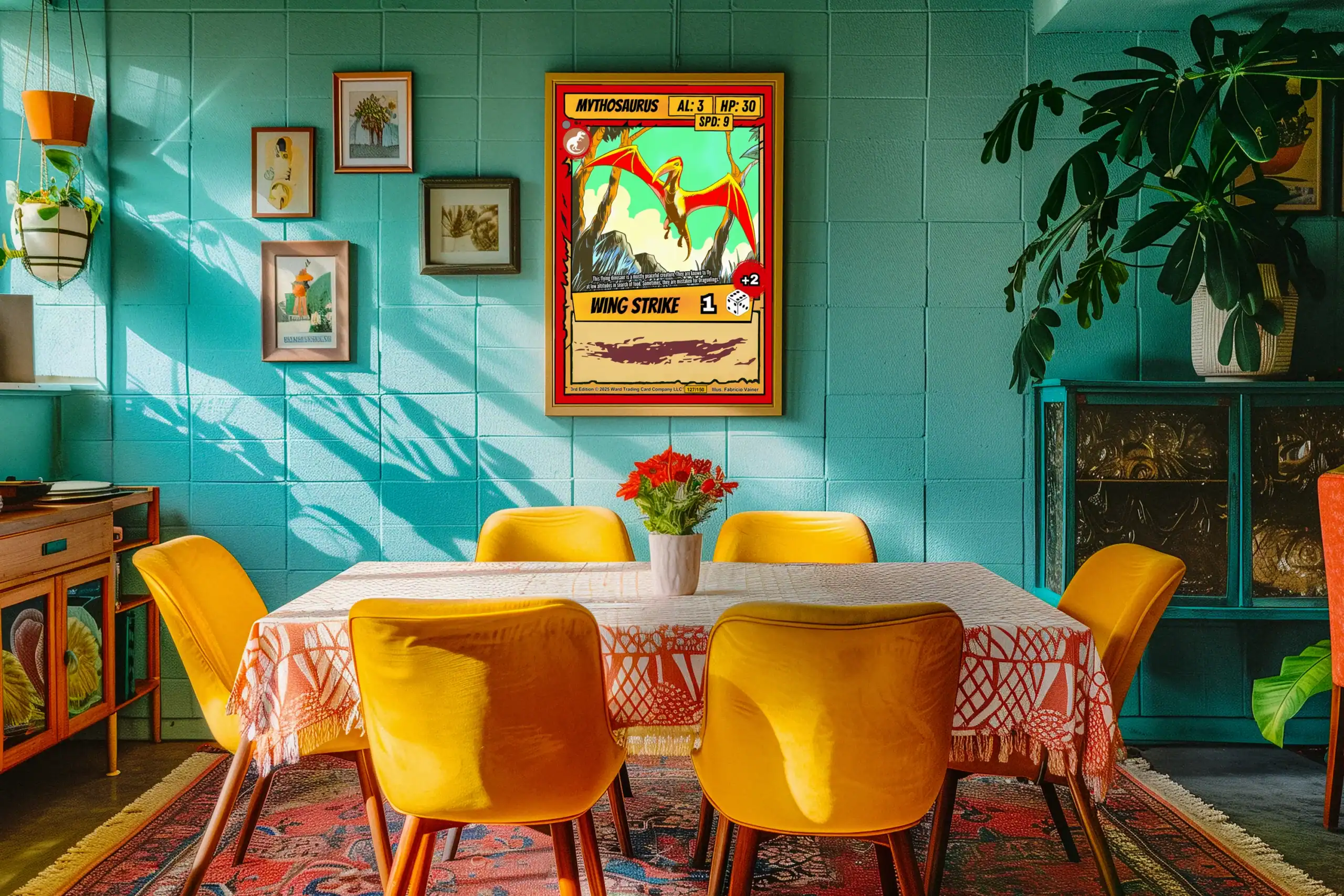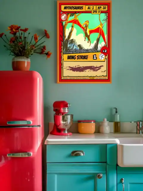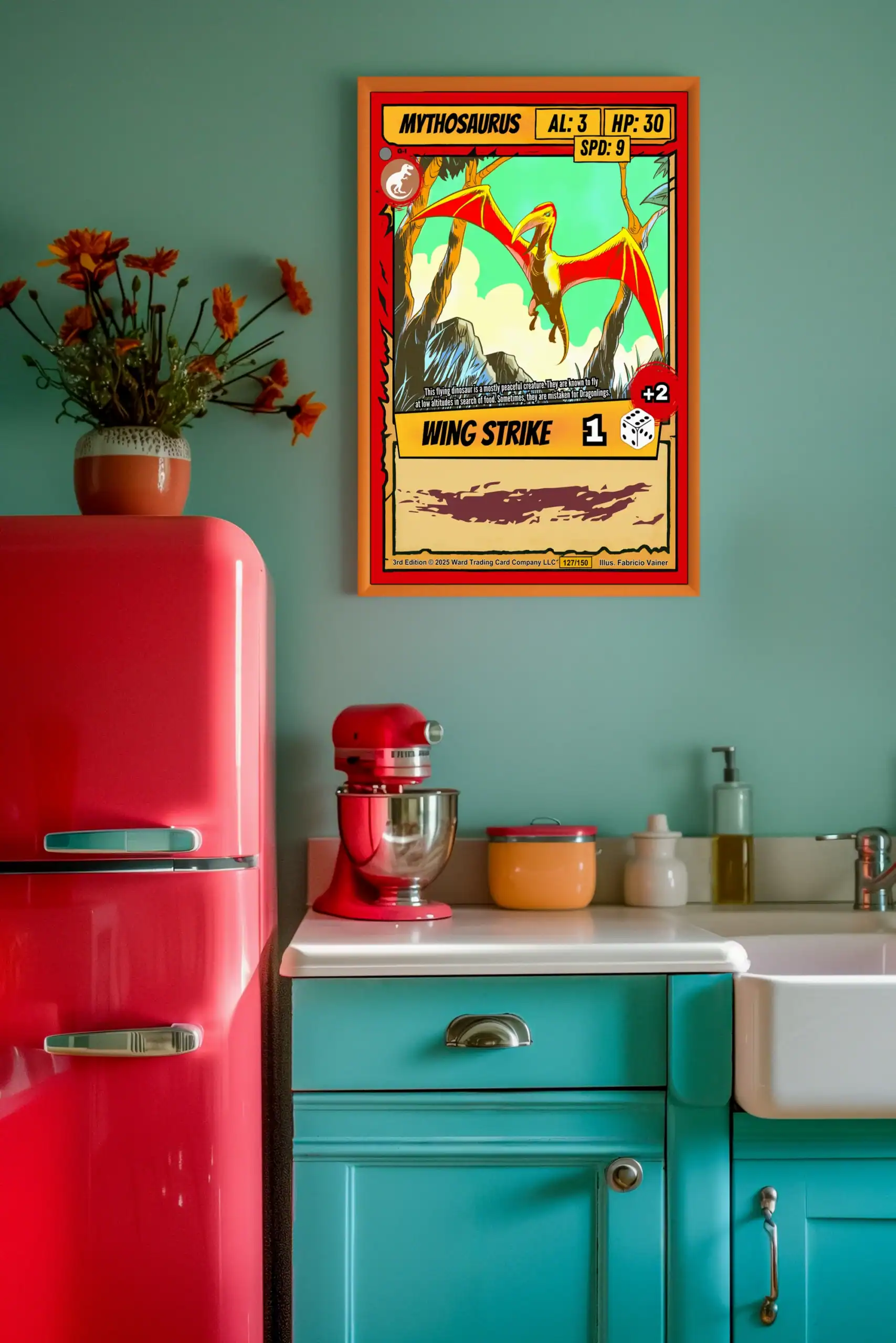 The Wing Strike ability notation reveals this as a speed-focused creature card. TCG collectors recognize Vainer’s signature cel-shading technique immediately. This mythosaurus trading card canvas print particularly appeals to Ward enthusiasts.