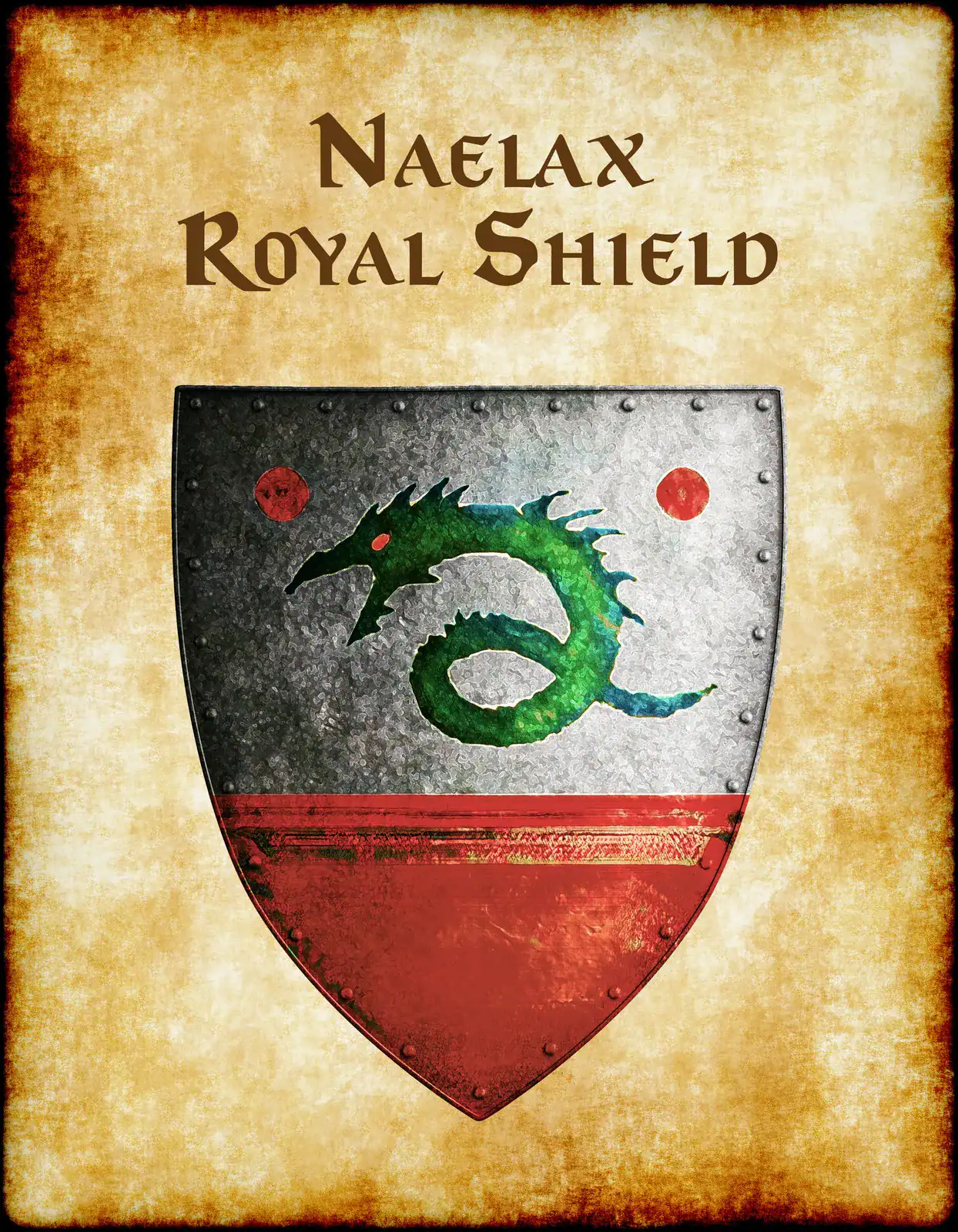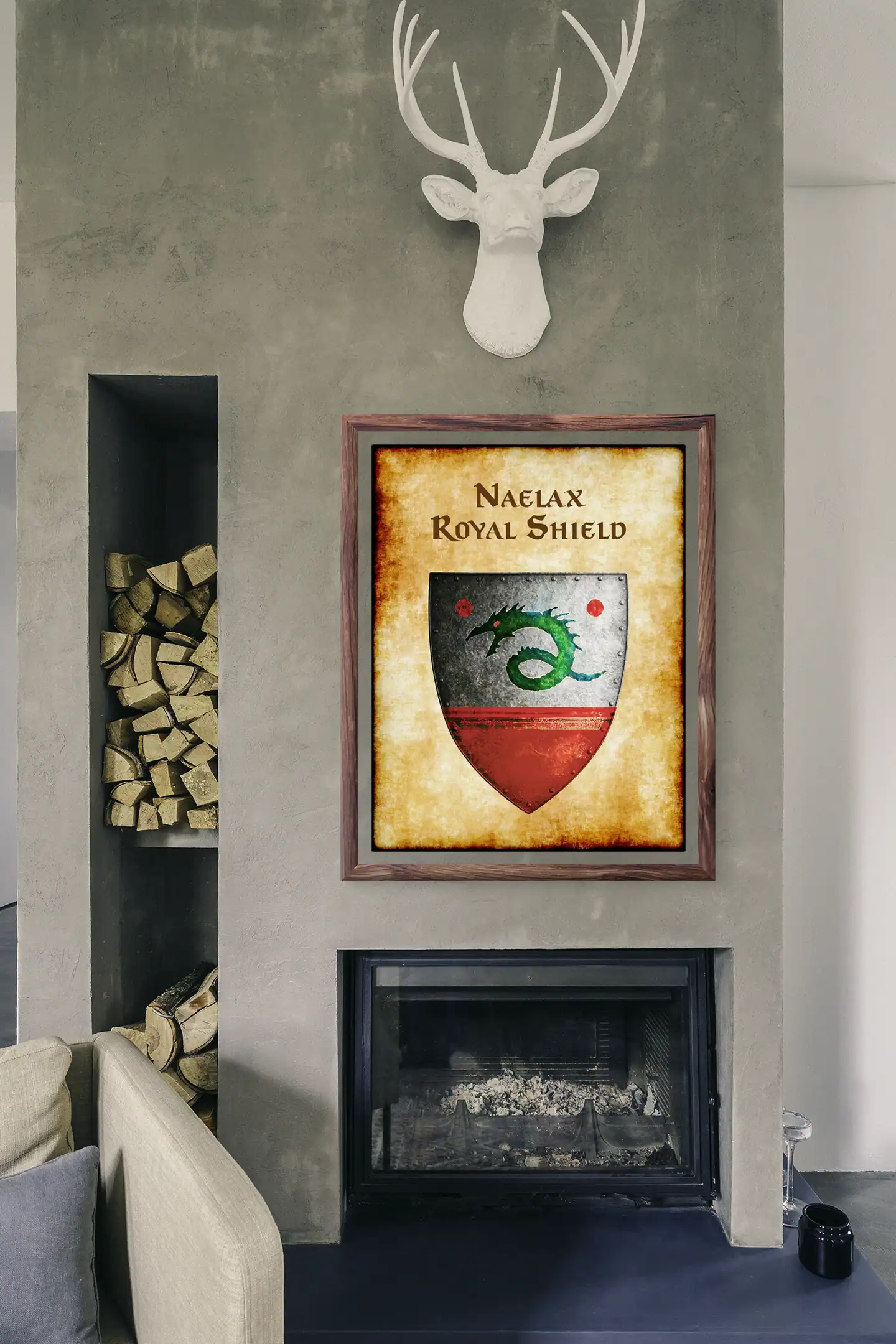 A green dragon coils across weathered silver and crimson fields. This naelax royal shield Greyhawk heraldry canvas print captures House Naelax’s ancient authority. Notably, red roundels punctuate the silver field like watchful eyes.