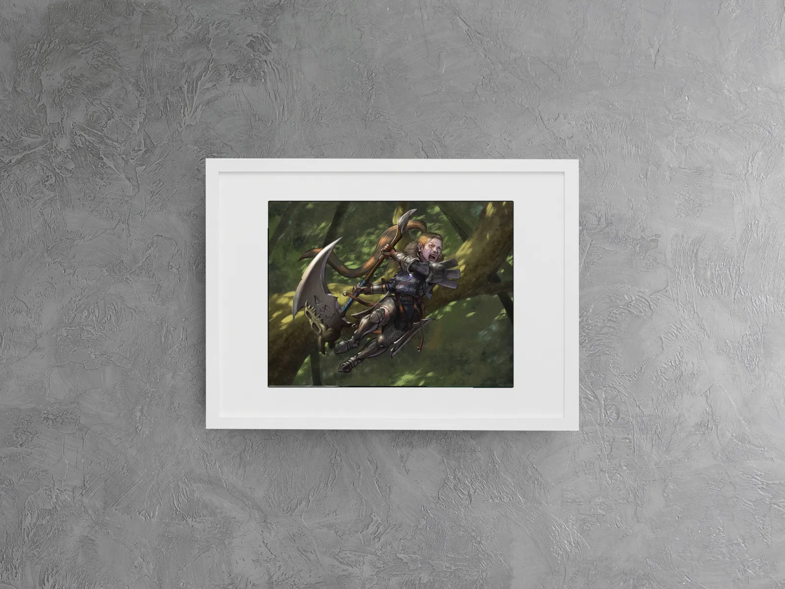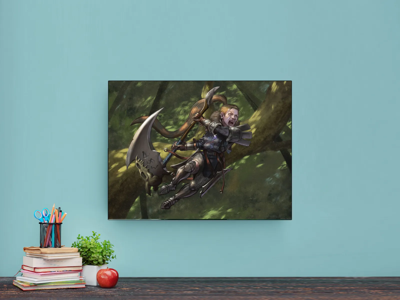 Therefore, collectors seeking dynamic character artwork, gamers or tabletop fans building immersive environments, and anyone enhancing a wall display in a game room, studio, or creative space will find this scene adds force, motion, and narrative intensity.
