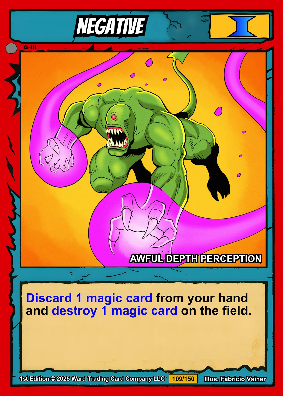 Additionally, the card layout features a bright red border with sharp black accent lines. A blue banner at top displays ‘NEGATIVE’ in white block letters. The yellow cost indicator shows ‘I’ in the upper right corner.