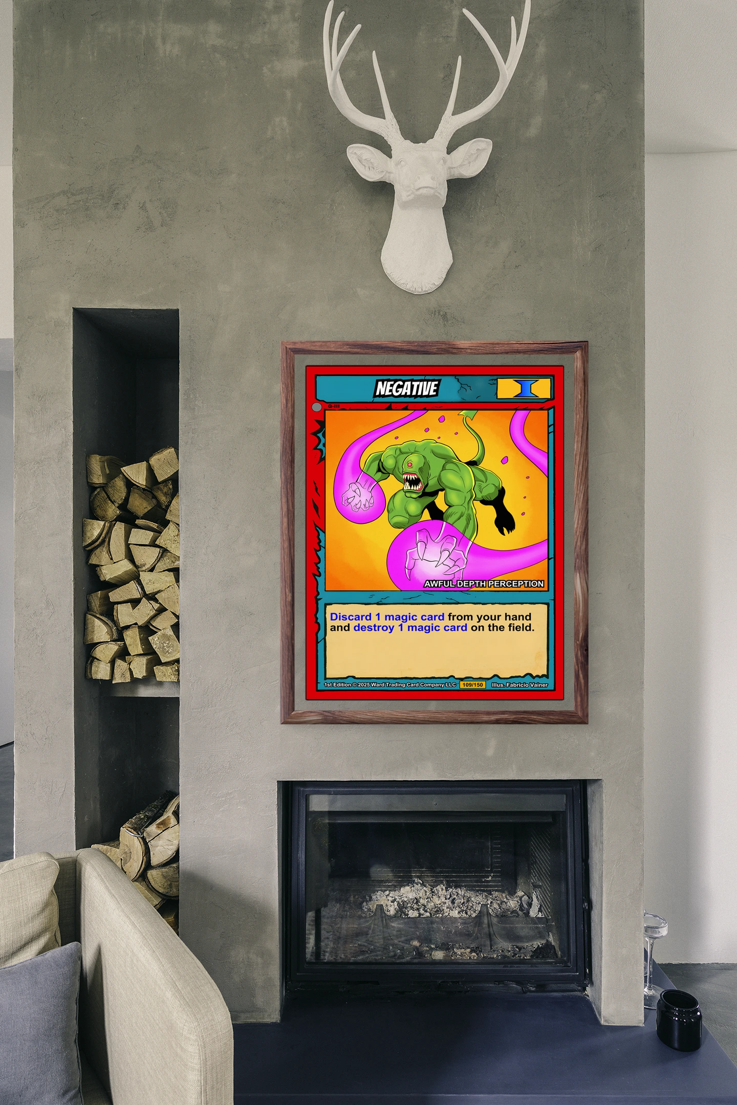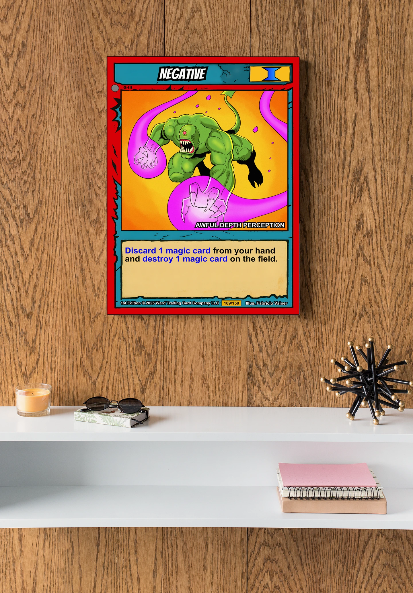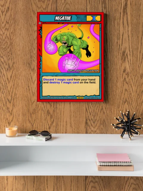 At room scale, the cel-shaded illustration reads with Saturday morning cartoon intensity. This negative trading card canvas print appeals to Ward TCG collectors who value humor in their monster roster. The subtitle ‘AWFUL DEPTH PERCEPTION’ delivers the punchline below the cyclops artwork.