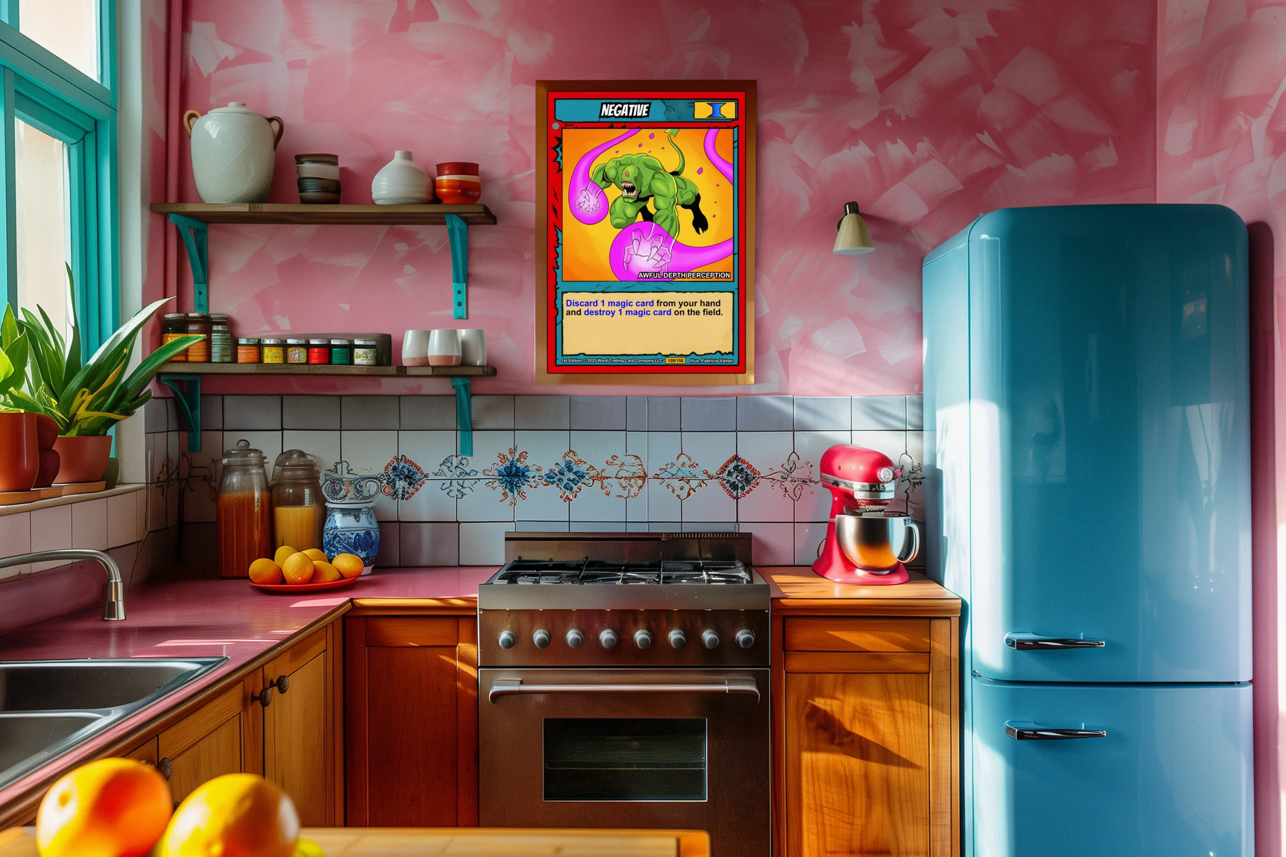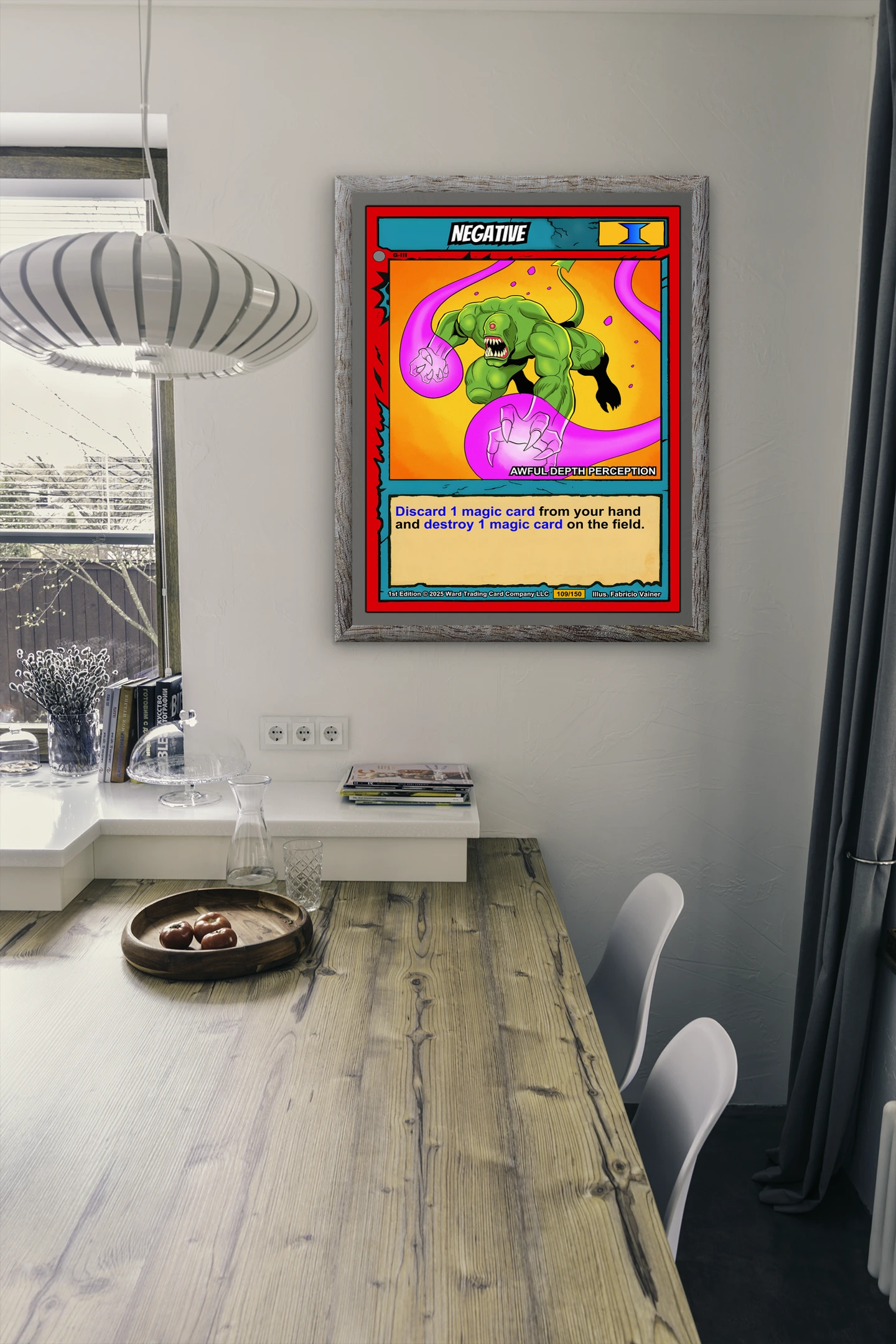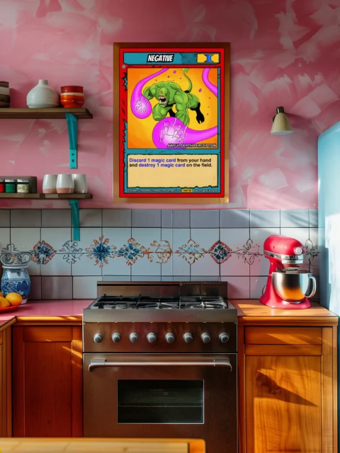 This piece anchors a trading card gallery wall or game room display. Indeed, the high-saturation palette holds attention even in bright lighting conditions.