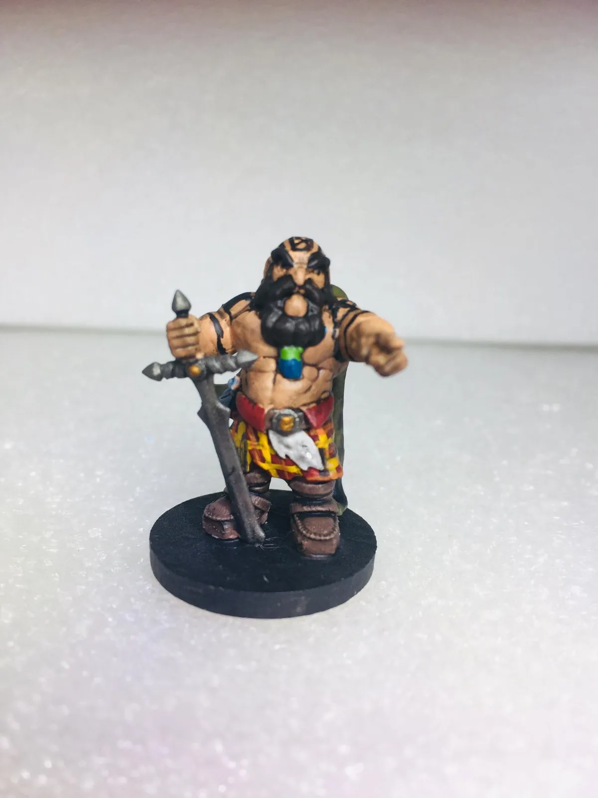 In the composition, his pointing arm drives the eye forward while the planted greatsword anchors vertical weight. The braided beard cascades in thick coiled segments bound with rings, framing a tartan kilt marked with skull iconography. Specifically, the furrowed brow and tattooed scalp offer concentrated expression work for painters building character through facial tension.