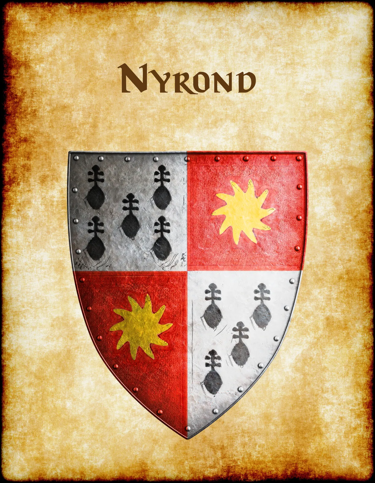 A quartered shield alternates argent and gules fields with sable ermine spots and golden sunbursts. This nyrond Greyhawk heraldry canvas print displays the device of the Kingdom of Nyrond. Notably, riveted metallic edges frame the quartered design against aged parchment.