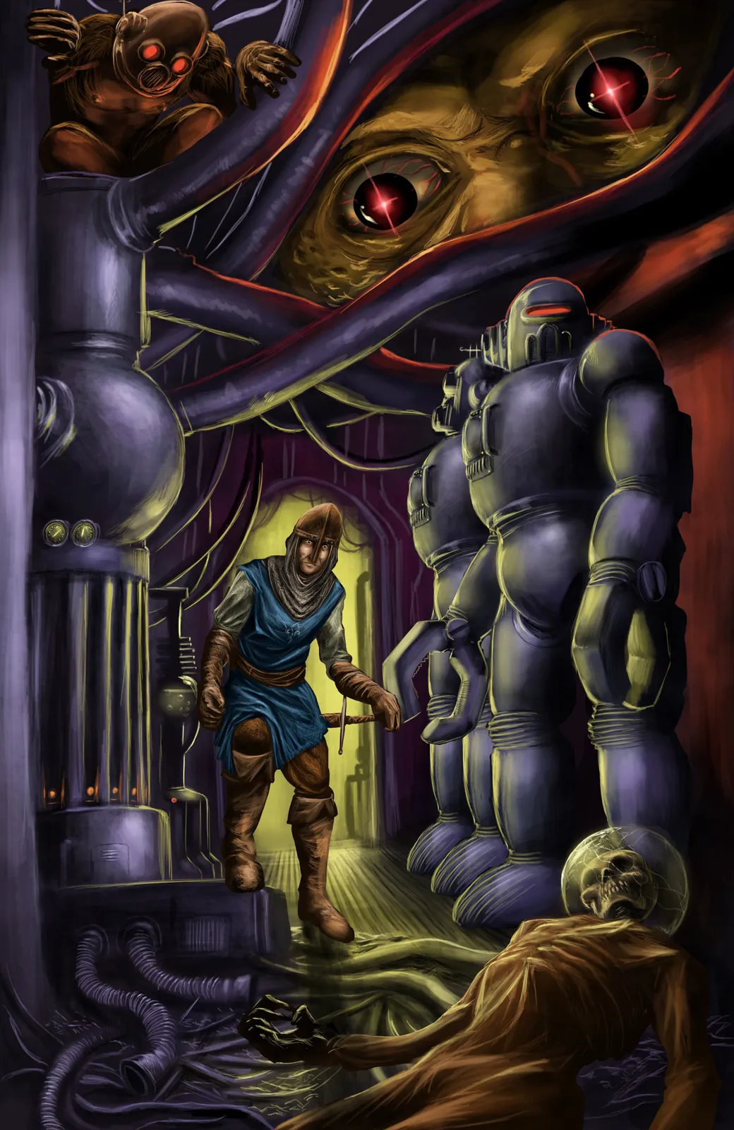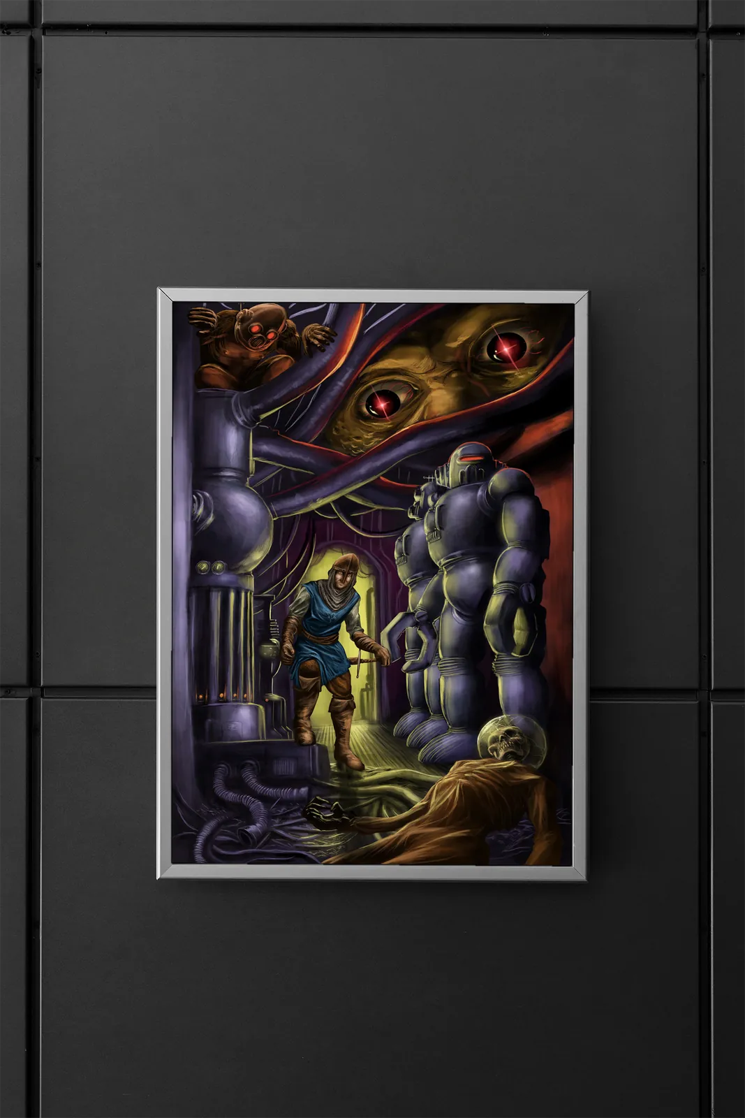Additionally, the composition compresses space through towering armored sentinels, curling conduits, and the intruding hero stepping forward. However, the creature’s embedded eyes, grasping limbs, and converging verticals drive motion inward, creating a claustrophobic pull toward the unknown intelligence controlling the room.