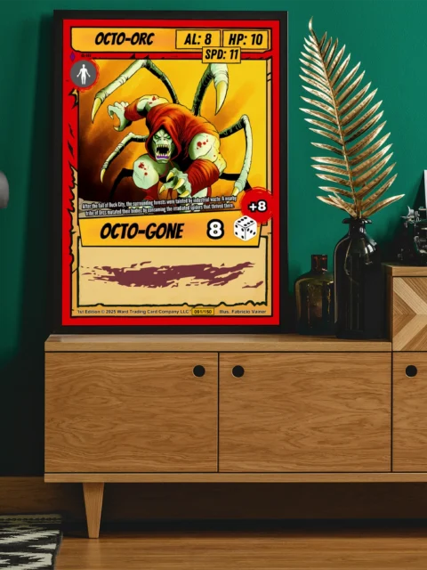 The layout reads clearly from across the room, every stat box and icon sharp at wall scale. Ward TCG collectors recognize the 091/150 card number and Fabricio Vainer illustration credit. This octo orc trading card canvas print suits buyers who want horror fantasy artwork with game-accurate detail.