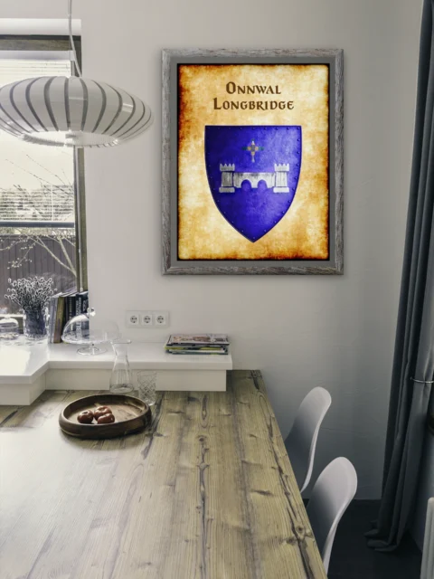 Additionally, the bridge represents Longbridge itself — Onnwal’s fortified river crossing into the Headlands. The azure field contrasts sharply with the argent stonework and verdant cross charges. Moreover, Anna Meyer’s rendering includes riveted shield edges and aged parchment backing for archival authenticity.