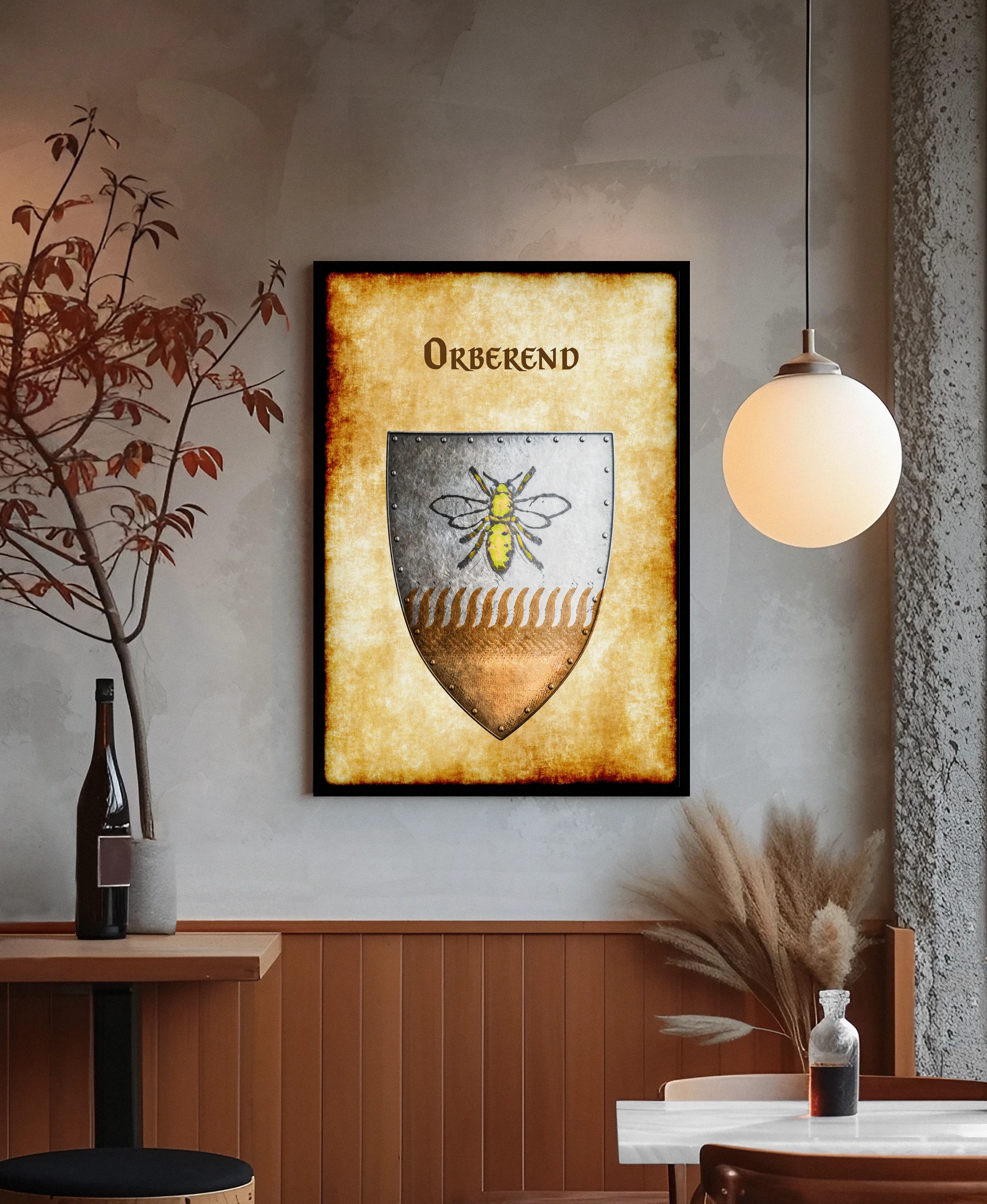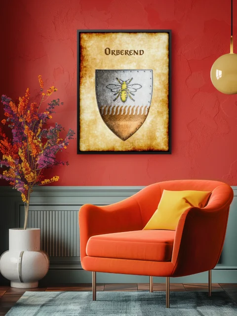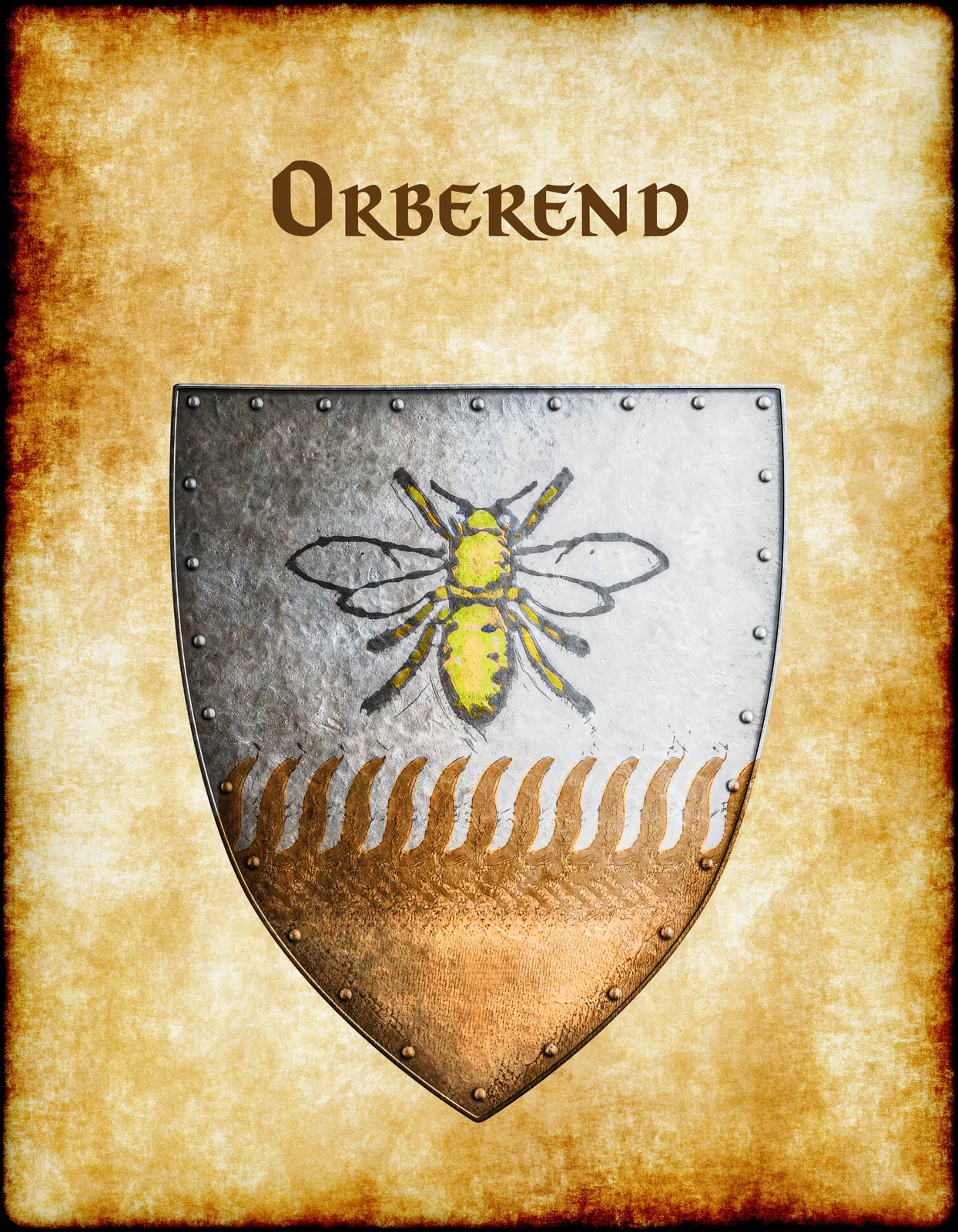 A heater shield divides horizontally between argent and bronze fields. This orberend Greyhawk heraldry canvas print displays the rural barony’s golden bee charge. Notably, riveted borders frame the device while wheat motifs separate the tinctures.