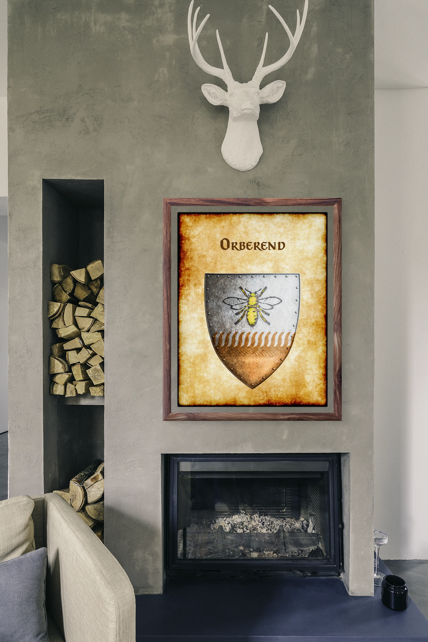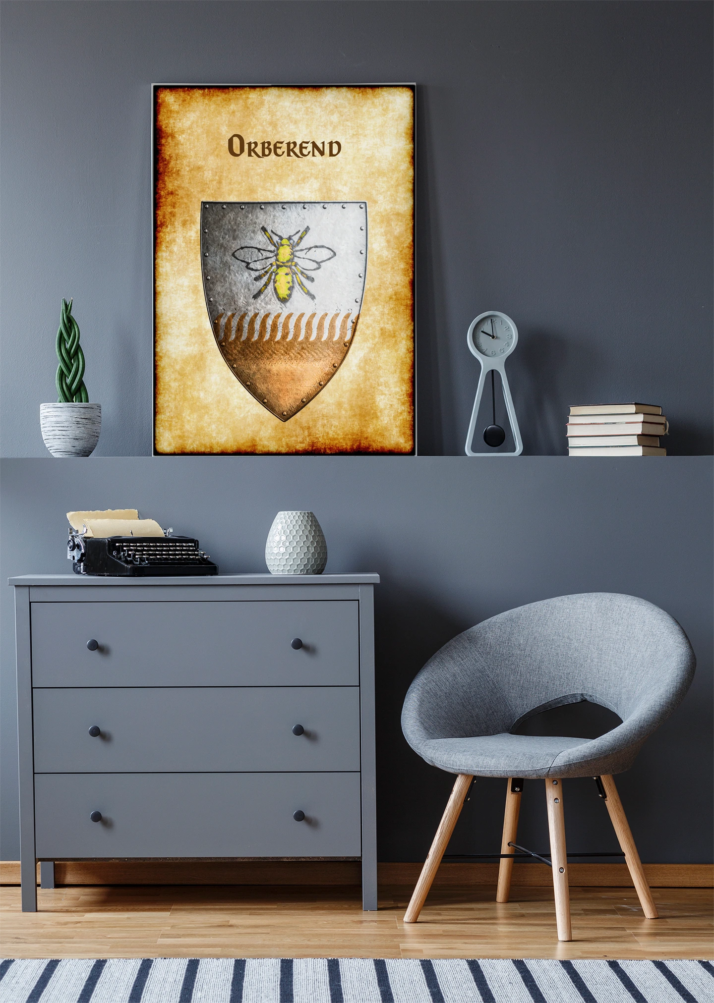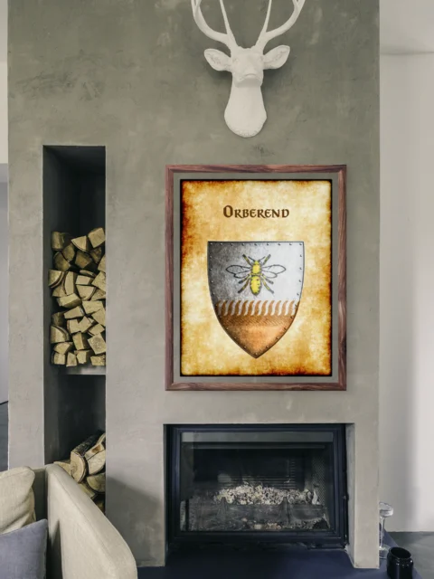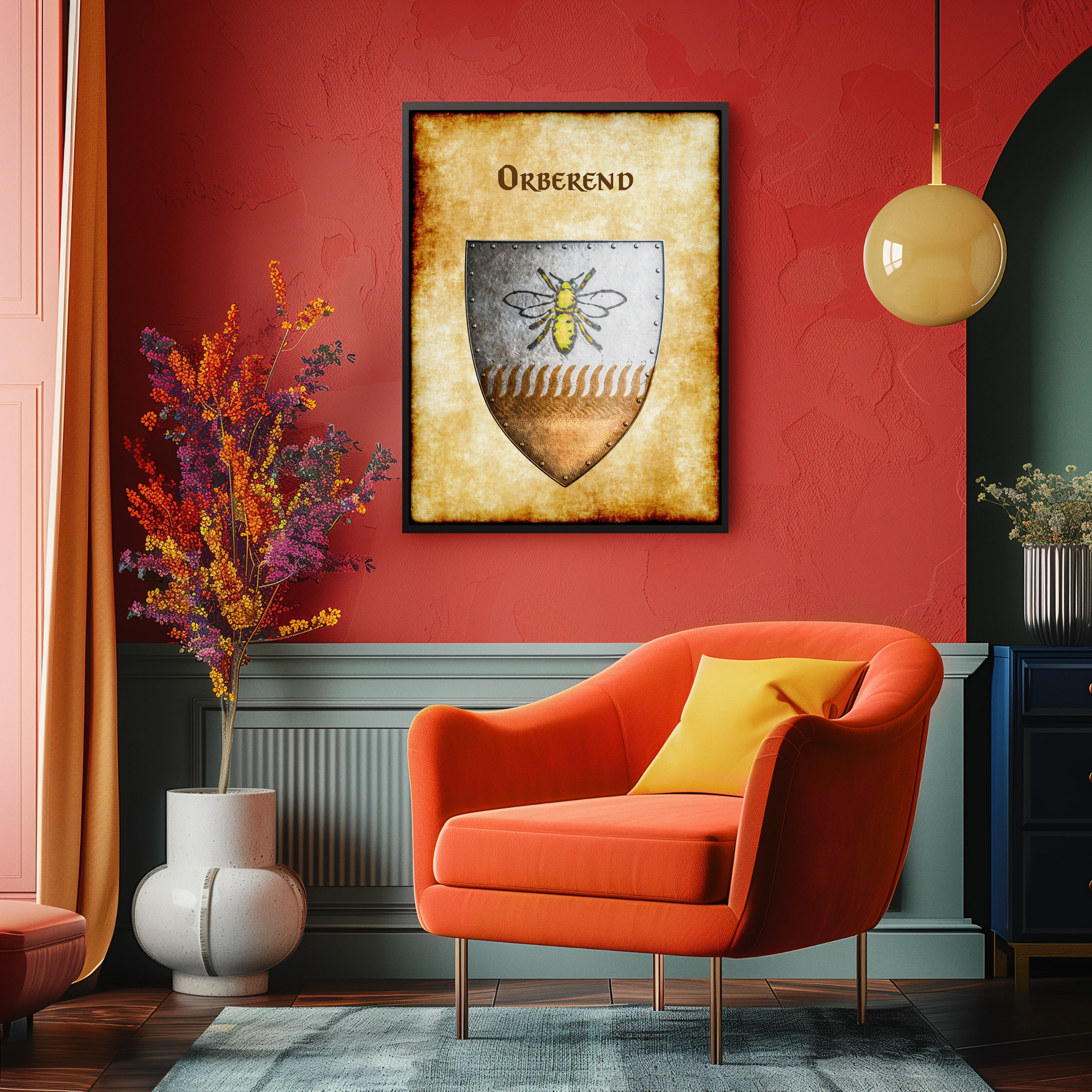 A heater shield divides horizontally between argent and bronze fields. This orberend Greyhawk heraldry canvas print displays the rural barony’s golden bee charge. Notably, riveted borders frame the device while wheat motifs separate the tinctures.