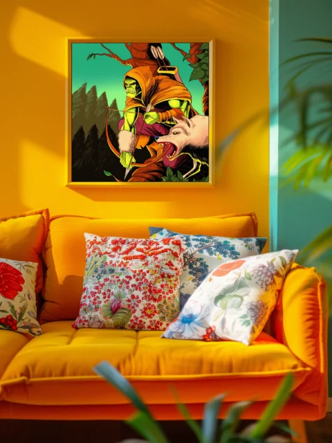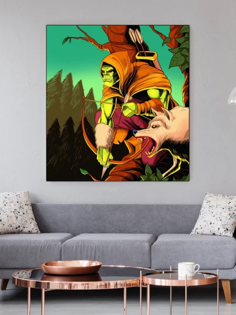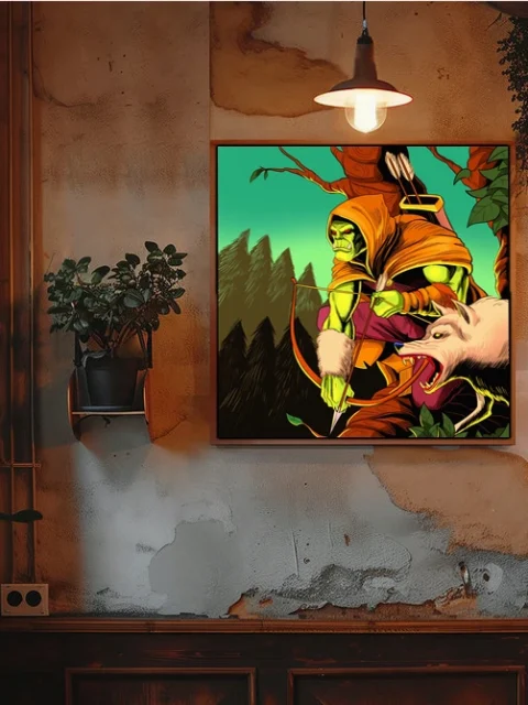 Mount this in a game room where the savage hunter aesthetic complements fantasy miniature displays or TCG collections. Additionally, the comic book styling works particularly well alongside graphic novel art or bold fantasy posters.