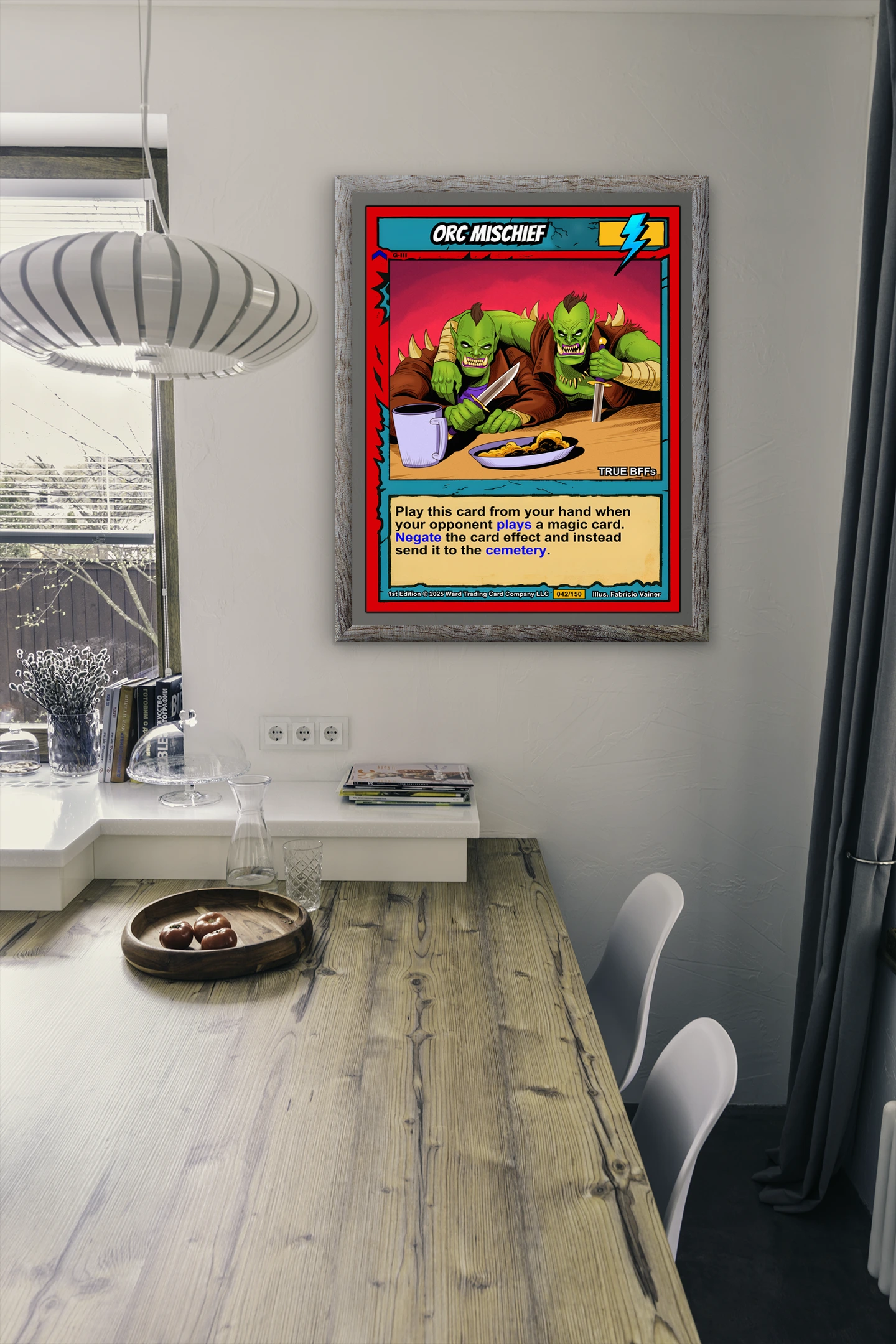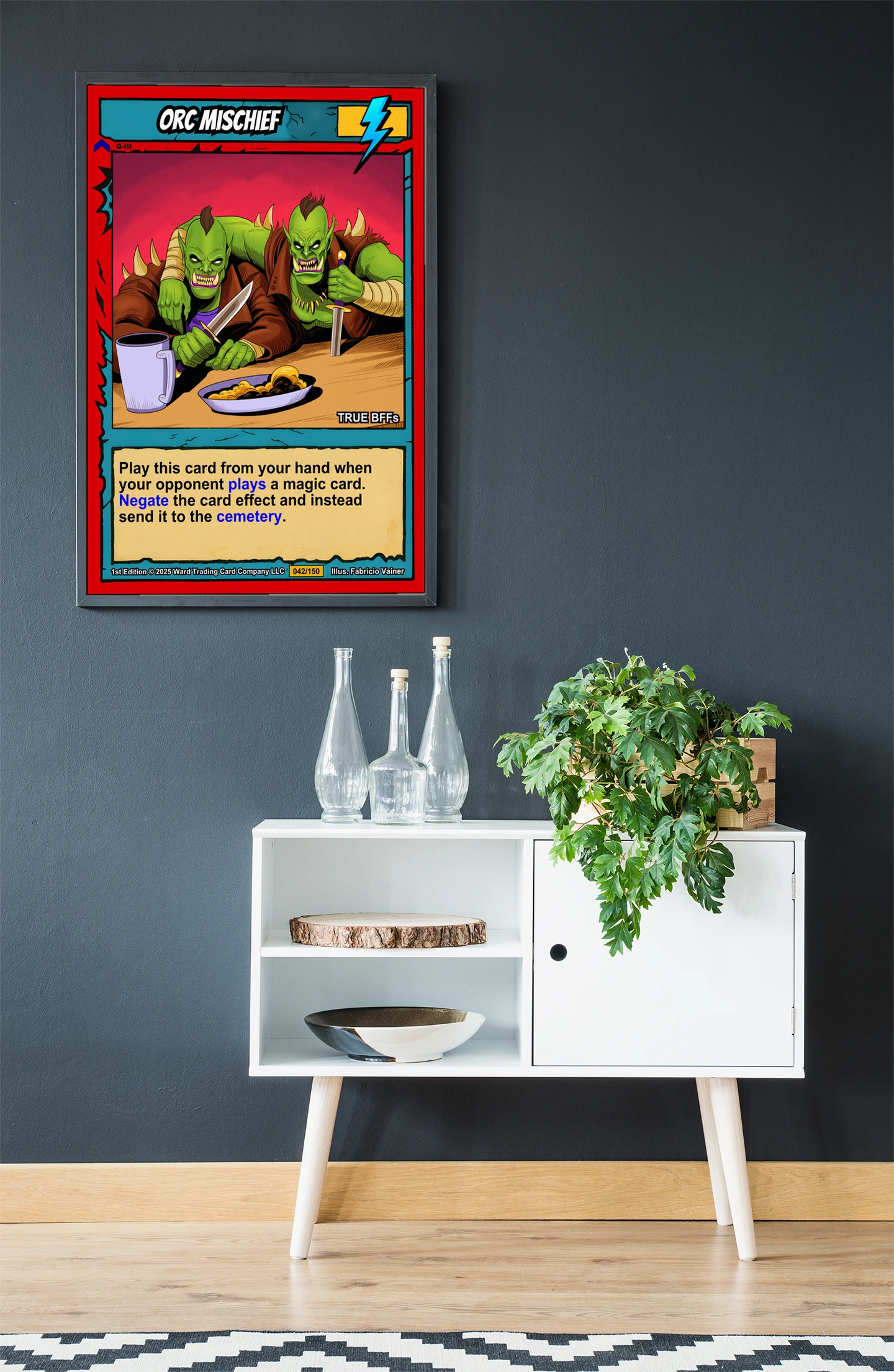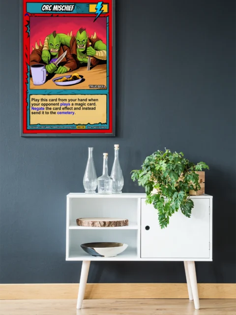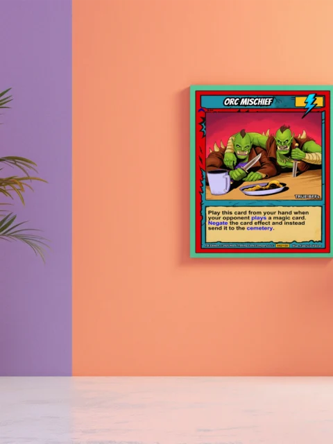 At room scale, the cel-shaded illustration and high-saturation colors read clearly across any space. Collectors of Ward TCG artwork and fantasy game enthusiasts recognize the humor immediately. This orc mischief trading card canvas print brings that playful menace to the wall.