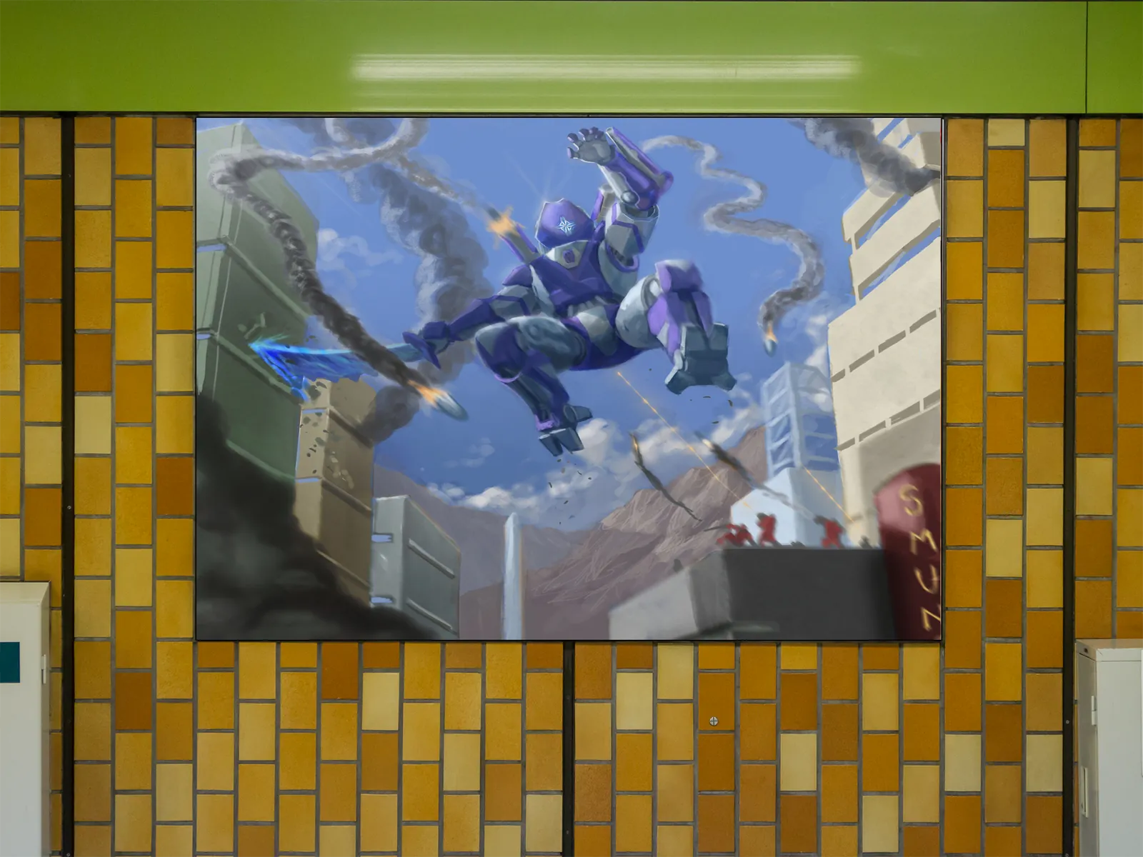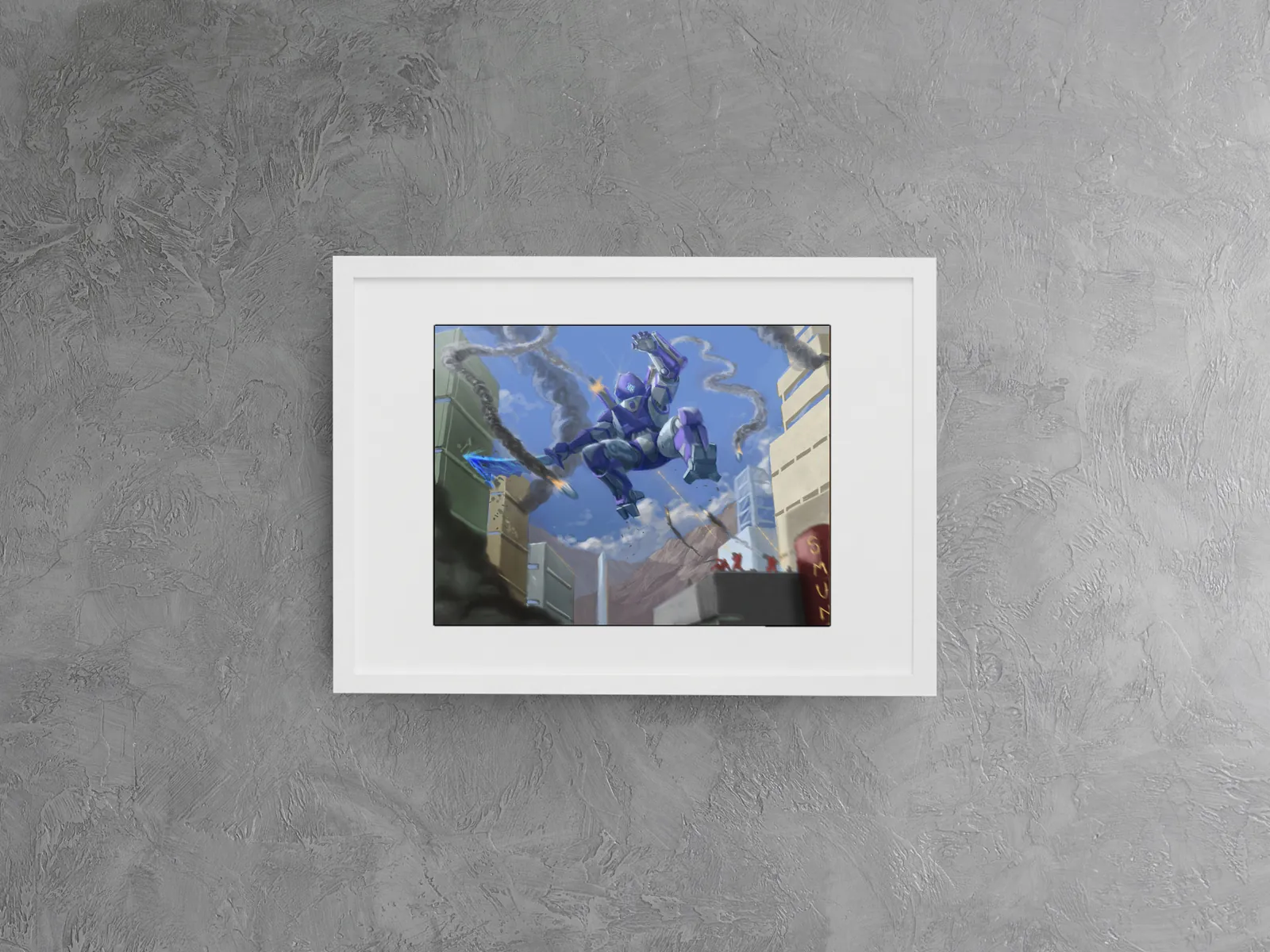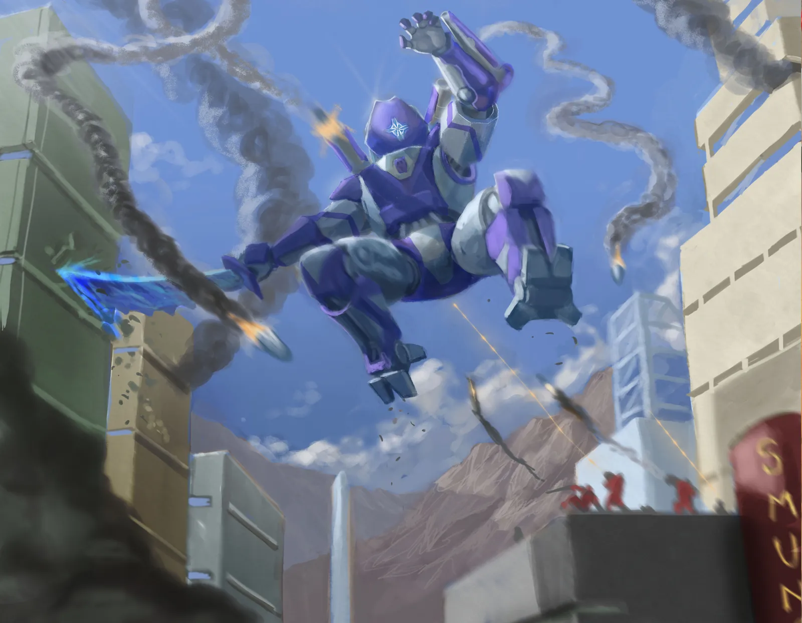 Additionally, the composition emphasizes vertical momentum, pulling the eye upward along the mech’s raised arm and bent legs. However, the surrounding buildings and distant terrain ground the action, providing scale and contrast that prevent the chaos from overwhelming the scene. Consequently, the balance between airborne motion and solid structure keeps the image readable while preserving intensity.
