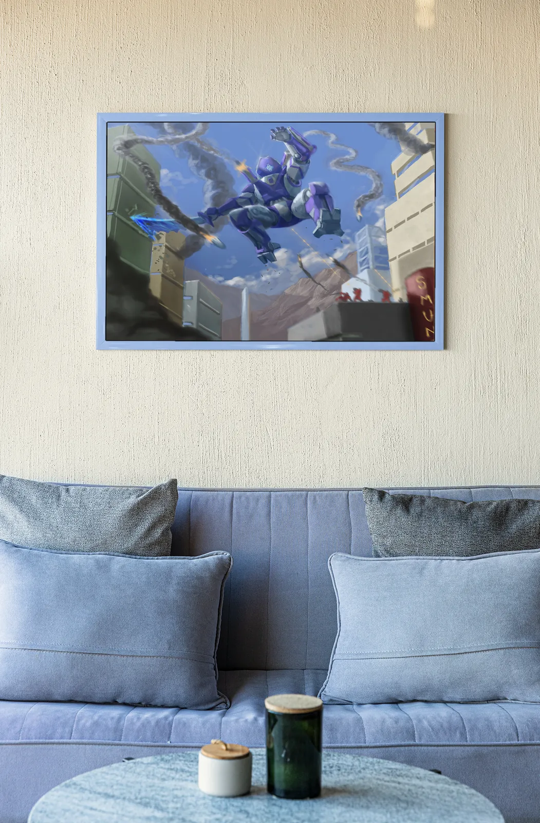 Finally, displayed as orcm52 canvas art, the cool blues of the armor and the warm flashes of impact translate with clarity and depth. The fine art canvas surface enhances detail in the smoke, metal plating, and distant figures, giving the artwork a commanding presence that energizes a wall without visual clutter.