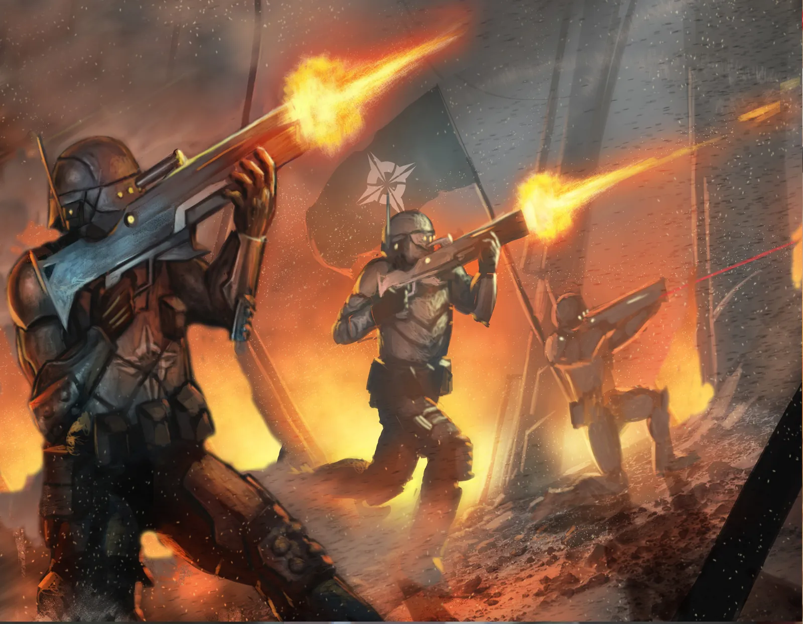 Origin Infantry surges through fire and debris as armored soldiers advance in tight formation, establishing origin infantry canvas art as a moment defined by resolve and coordinated force. Moreover, muzzle flashes tear through the smoke-filled air while the squad presses forward, their silhouettes cutting sharply against the glow of burning ground and falling ash.